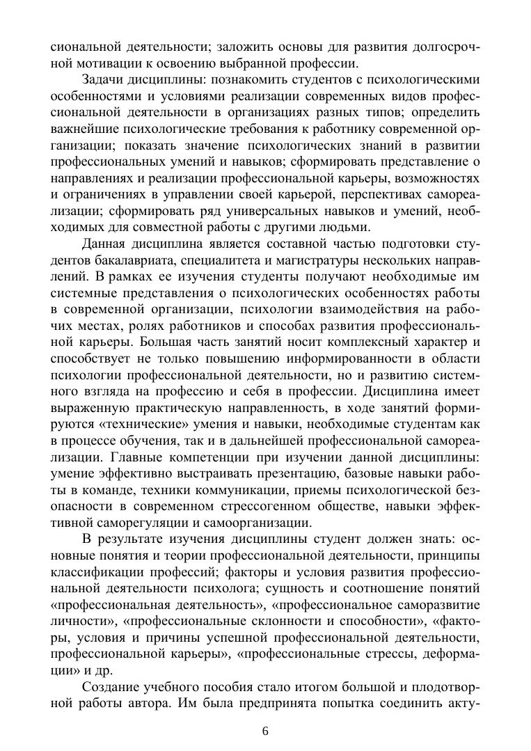 Создание учебного пособия явилось ответом на запрос как академической, так и экономической жизни. Здесь предпринята попытка соединить актуальные теоретические подходы в области изучения профессиональной деятельности с практическими вопросами, решение которых является показателем грамотности и компетентности молодого специалиста. В представленном пособии системно излагаются вопросы психологии профессиональной деятельности: проблема мотивация к эффективному труду, роль способностей в трудовом процессе, интеллект и познавательная деятельность как условие профессионального становления, риски эмоционального выгорания работников и многие другие. Учебное пособие предназначено для бакалавров, магистрантов и аспирантов экономических и управленческих направлениям подготовки. Также оно призвано быть интересном широкому кругу читателей, интересующихся психологией деловых отношений.