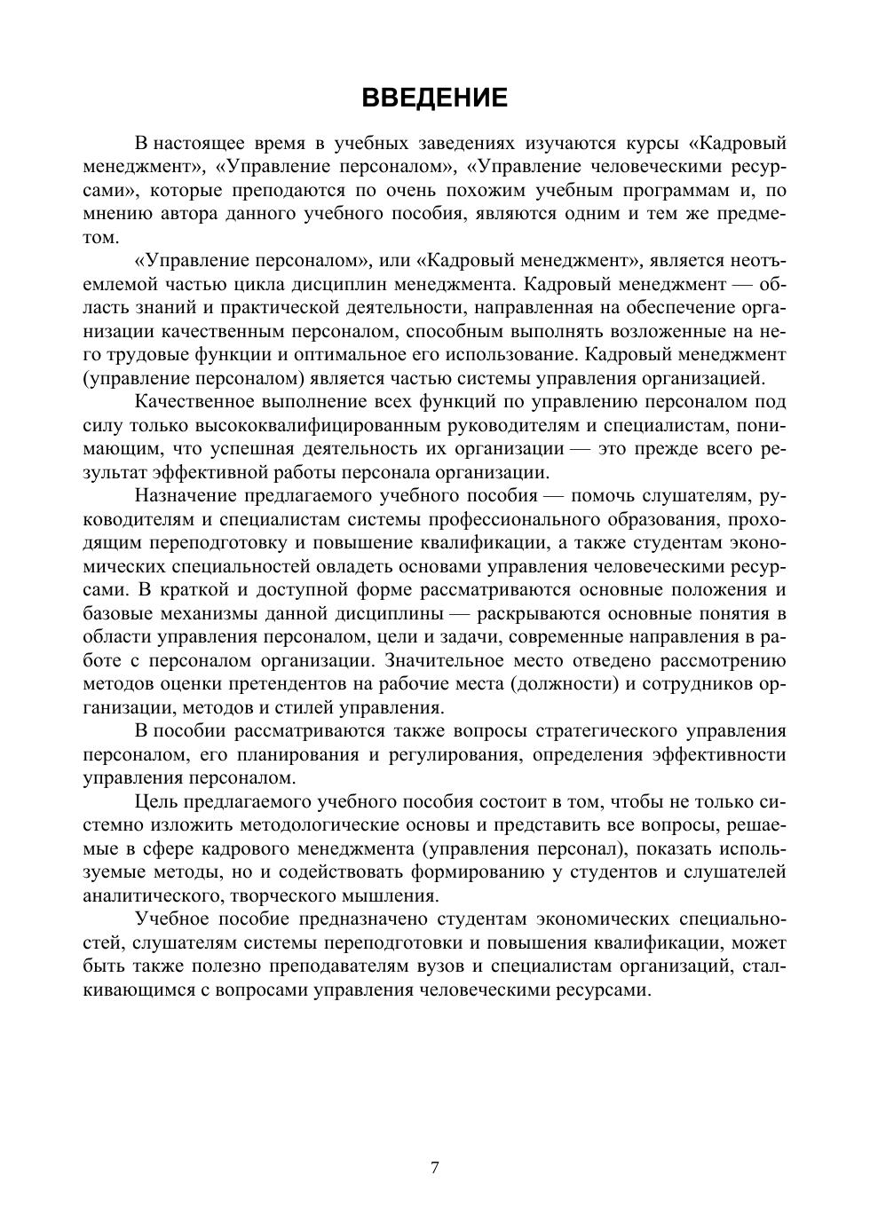 В учебном пособии подаются в простой и удобной форме основные материалы из сферы кадрового менеджмента. В нем определяется сущность, центральные принципы кадрового менеджмента и показана взаимосвязь важнейших понятий: «кадровый менеджмент», «управление персоналом», «управление человеческими ресурсами». Кратко дается история становления управления персоналом как науки и учебной дисциплины. Значительное место отведено рассмотрению методов оценки претендентов на рабочие места и уже работающих сотрудников организации, а также методов и стилей управления руководителей. В заключение рассматриваются вопросы стратегического управления персоналом. Учебное пособие предназначено прежде всего для студентов вузов, обучающимся по экономическим направлениям подготовки, но может быть использовано при преподавании основ менеджмента и управления персоналом студентам других специальностей и направлений подготовки.