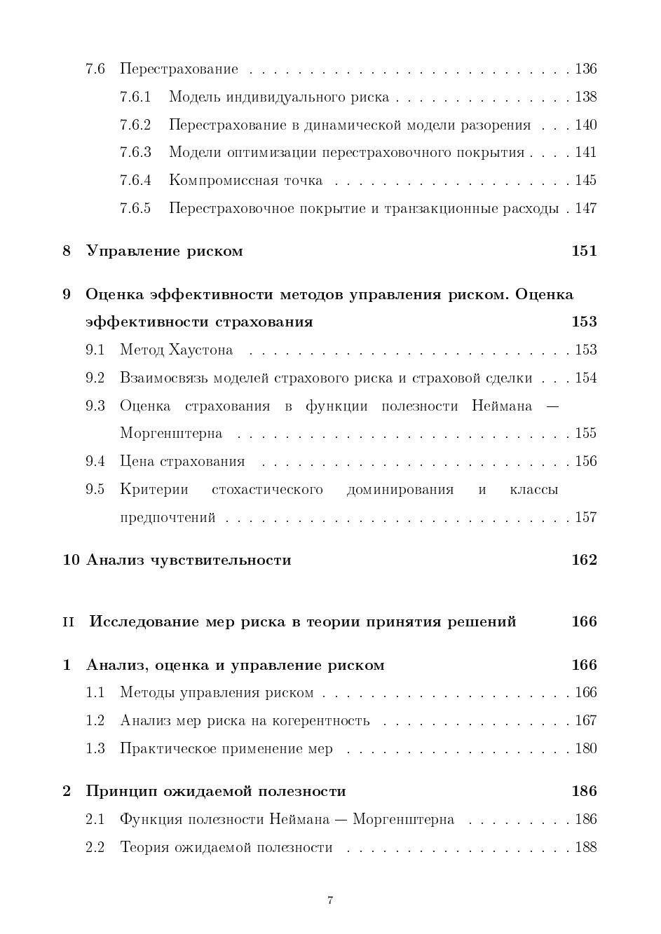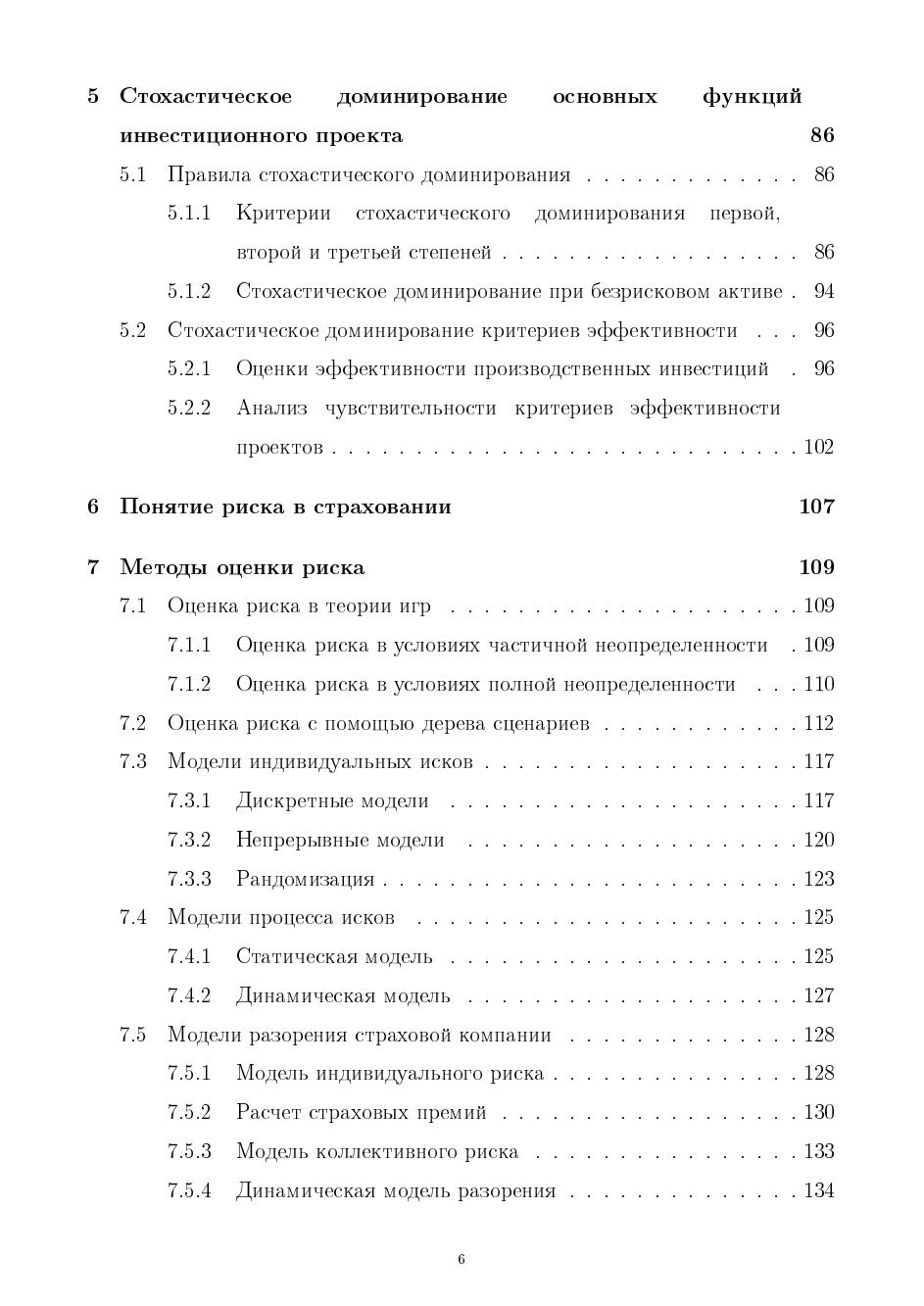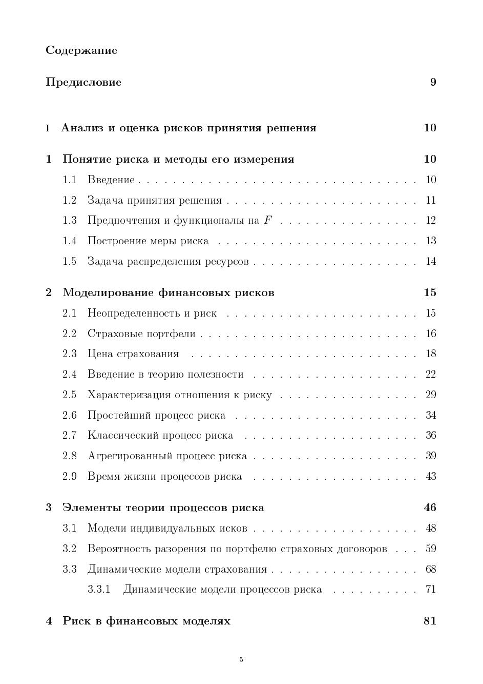 Вводятся понятия степеней, мер и порогов рисков, обсуждается проблема описания предпочтений на множестве вероятностных распределений, исследуется проблема интенсивности предпочтений. Рассматриваются страховые портфели, определяется цена страхования и время жизни процессов риска, приведены динамические процессы риска. Описан риск в финансовых моделях и стохастическое доминирование основных функций инвестиционного проекта. Приведены методы оценки риска модели разорения страховых компаний, перестрахования. Рассматривается анализ мер риска на когерентность, Показана связь степени рисковости и функции ожидаемой полезности. В основе работы лежат материалы специального курса лекций, читаемых в СПбГУ.