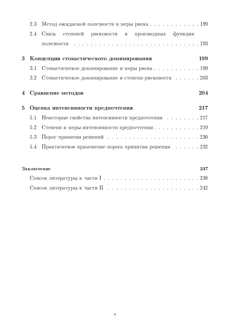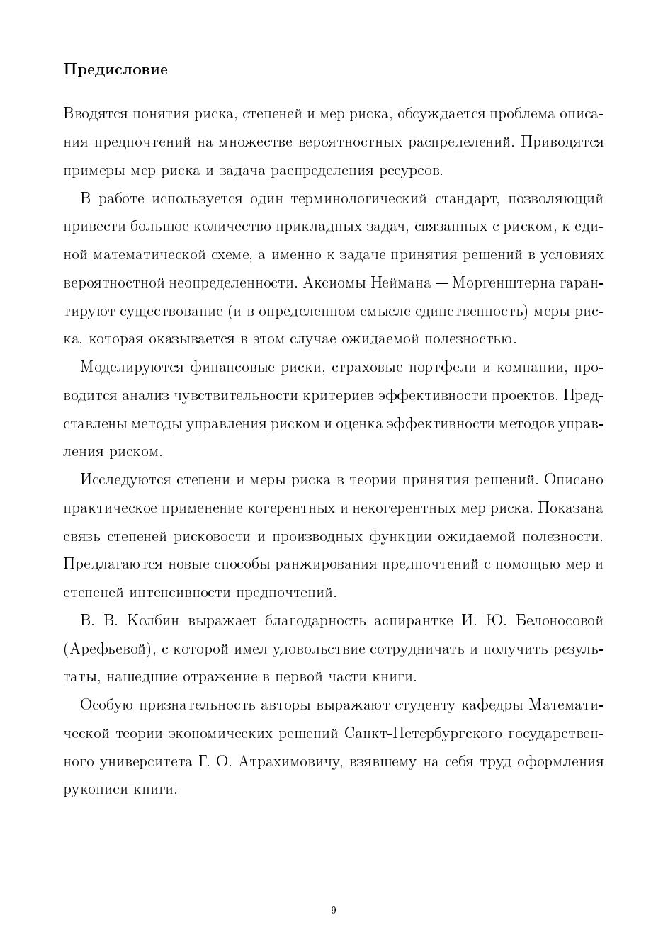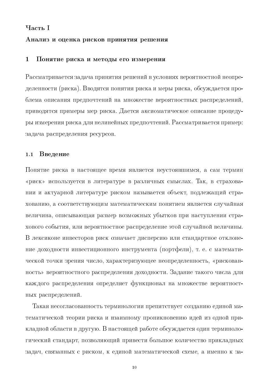 Вводятся понятия степеней, мер и порогов рисков, обсуждается проблема описания предпочтений на множестве вероятностных распределений, исследуется проблема интенсивности предпочтений. Рассматриваются страховые портфели, определяется цена страхования и время жизни процессов риска, приведены динамические процессы риска. Описан риск в финансовых моделях и стохастическое доминирование основных функций инвестиционного проекта. Приведены методы оценки риска модели разорения страховых компаний, перестрахования. Рассматривается анализ мер риска на когерентность, Показана связь степени рисковости и функции ожидаемой полезности. В основе работы лежат материалы специального курса лекций, читаемых в СПбГУ.