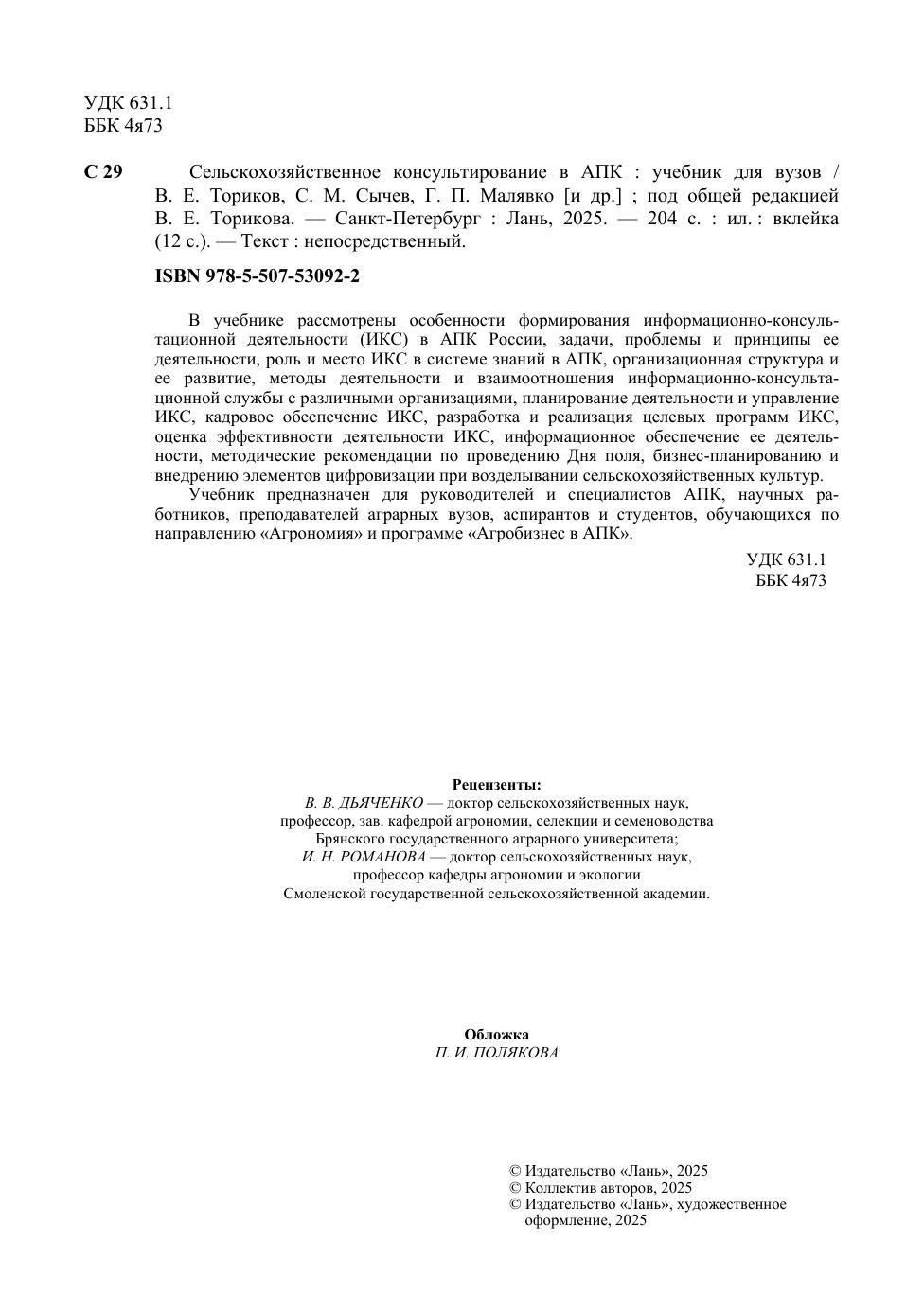 В учебнике рассмотрены особенности формирования информационно-консультационной деятельности (ИКС) в АПК России, задачи, проблемы и принципы ее деятельности, роль и место ИКС в системе знаний в АПК, организационная структура и ее развитие, методы деятельности и взаимоотношения информационно-консультационной службы с различными организациями, планирование деятельности и управление ИКС, кадровое обеспечение ИКС, разработка и реализация целевых программ ИКС, оценка эффективности деятельности ИКС, информационное обеспечение ее деятельности, методические рекомендации по проведению Дня поля, бизнес-планированию и внедрению элементов цифровизации при возделывании сельскохозяйственных культур. Учебник предназначен для руководителей и специалистов АПК, научных работников, преподавателей аграрных вузов, аспирантов и студентов, обучающихся по направлению «Агрономия» и программе «Агробизнес в АПК».