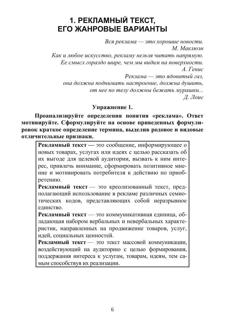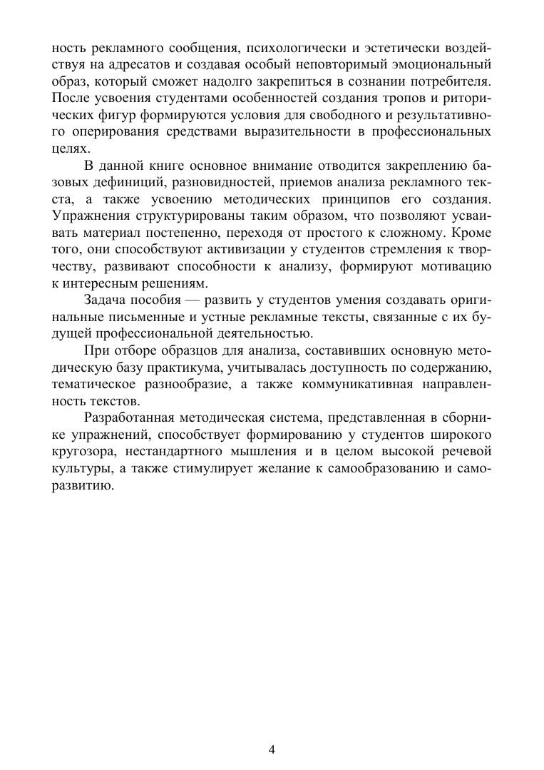 В сборнике собраны упражнения, направленные на развитие у студентов умений создавать тексты рекламных сообщений. Система заданий включает как разнообразный анализ образцов, так и активную творческую работу. Материалы каждой темы содержат небольшие теоретические справки («Немного теории!»), способствующие закреплению теоретического материала и облегчающие выполнение заданий. Пособие можно использовать на занятиях при изучении дисциплин «Речевые и письменные коммуникации», «Копирайтинг», «Мастер-класс „Работа с текстами в рекламе и связях с общественностью“» и др. Данная книга рассчитана на студентов направления «Реклама и связи с общественностью», а также широкий круг читателей: студентов, аспирантов, преподавателей и всех, кто интересуется спецификой рекламных текстов и особенностями их создания.