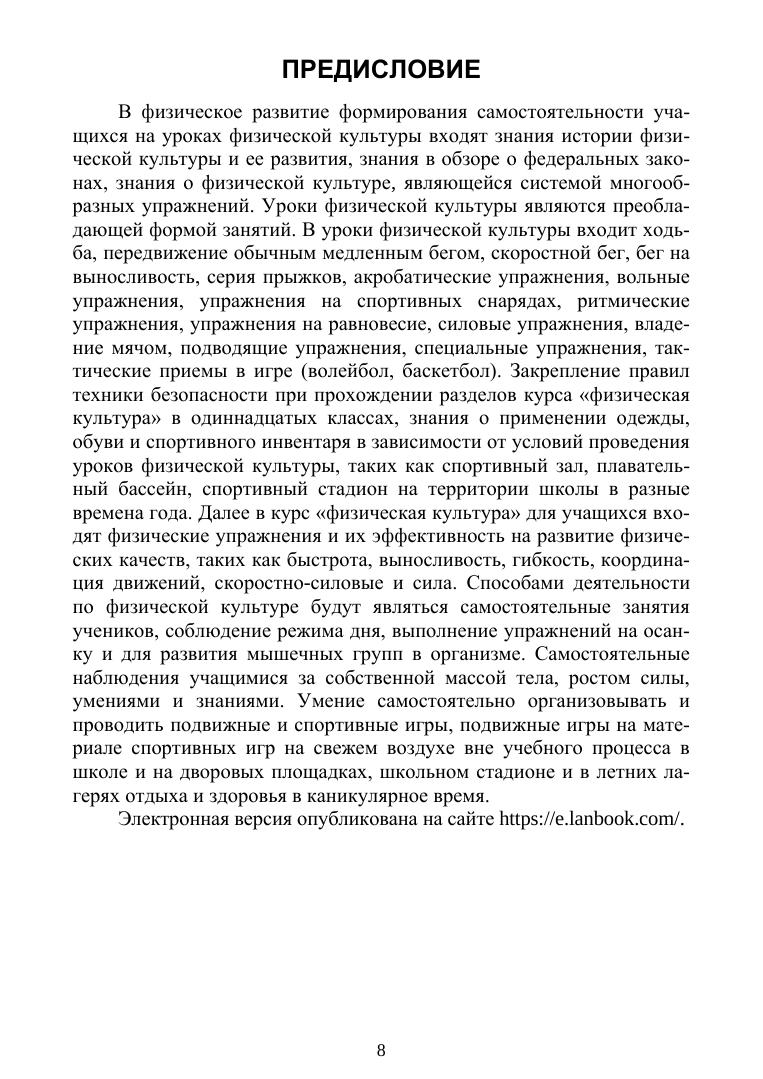 В пособии представлена структура уроков физической культуры для школьников 11 класса (девушки) с развернутыми конспектами и рабочей программой. Рассмотрены предметные, метапредметные и личностные результаты школьников на уроках физической культуры, приведены нормативы, определяющие физическое развитие детей. Очерчены действующие принципы и методы физического развития в формировании самостоятельности школьников на уроках физической культуры.