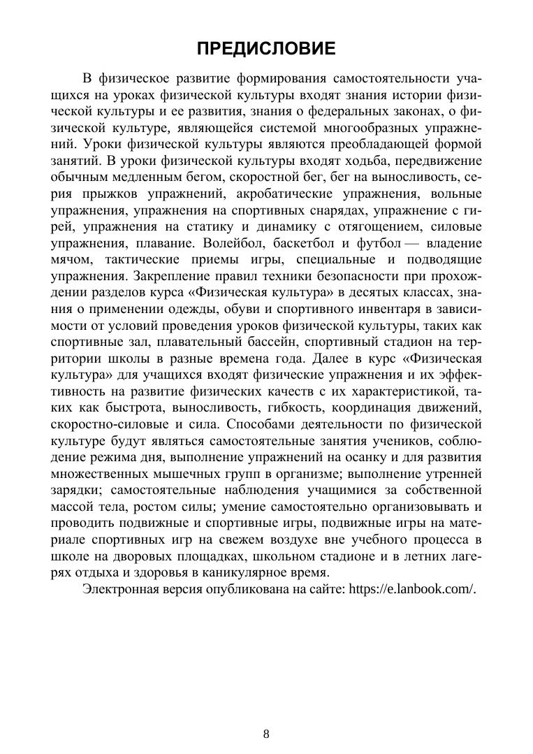 В пособии представлена структура уроков физической культуры для школьников 10 класса (юноши) с развернутыми конспектами и рабочей программой. Рассмотрены предметные, метапредметные и личностные результаты школьников на уроках физической культуры, приведены нормативы, определяющие физическое развитие детей. Очерчены действующие принципы и методы физического развития в формировании самостоятельности школьников на уроках физической культуры. Соответствует современным требованиям Федерального государственного образовательного стандарта среднего профессионального образования и профессиональным квалификационным требованиям.