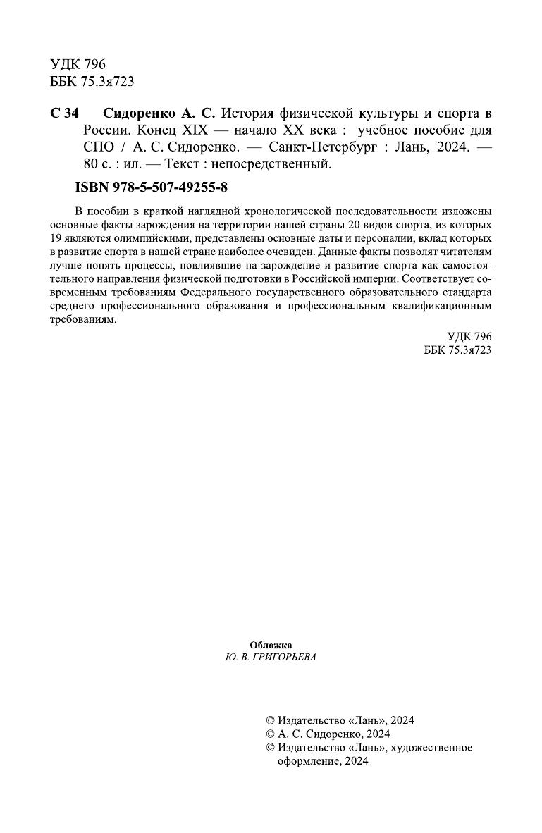 В пособии в краткой наглядной хронологической последовательности изло-жены основные факты зарождения на территории нашей страны 20 видов спорта, из которых 19 являются олимпийскими, представлены основные даты и персона-лии, вклад которых в развитие спорта в нашей стране наиболее очевиден. Данные факты позволят читателям лучше понять процессы, повлиявшие на зарождение и развитие спорта как самостоятельного направления физической подготовки в Российской империи. Соответствует современным требованиям Федерального государственного образовательного стандарта среднего профессионального образования и профессиональным квалификационным требованиям.
