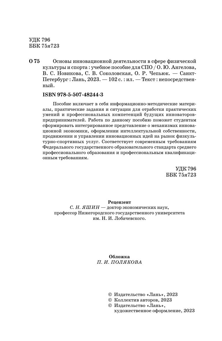 Пособие включает в себя информационно-методические материалы, практические задания и ситуации для отработки практических умений и профессиональных компетенций будущих инноваторов-предпринимателей. Работа по данному пособию поможет студентам сформировать интегрированное представление о механизмах инновационной экономики, оформлении интеллектуальной собственности, продвижении и управлении инновационных идей на рынок физкультурно-спортивных услуг. Соответствует современным требованиям Федерального государственного образовательного стандарта среднего профессионального образования и профессиональным квалификационным требованиям.