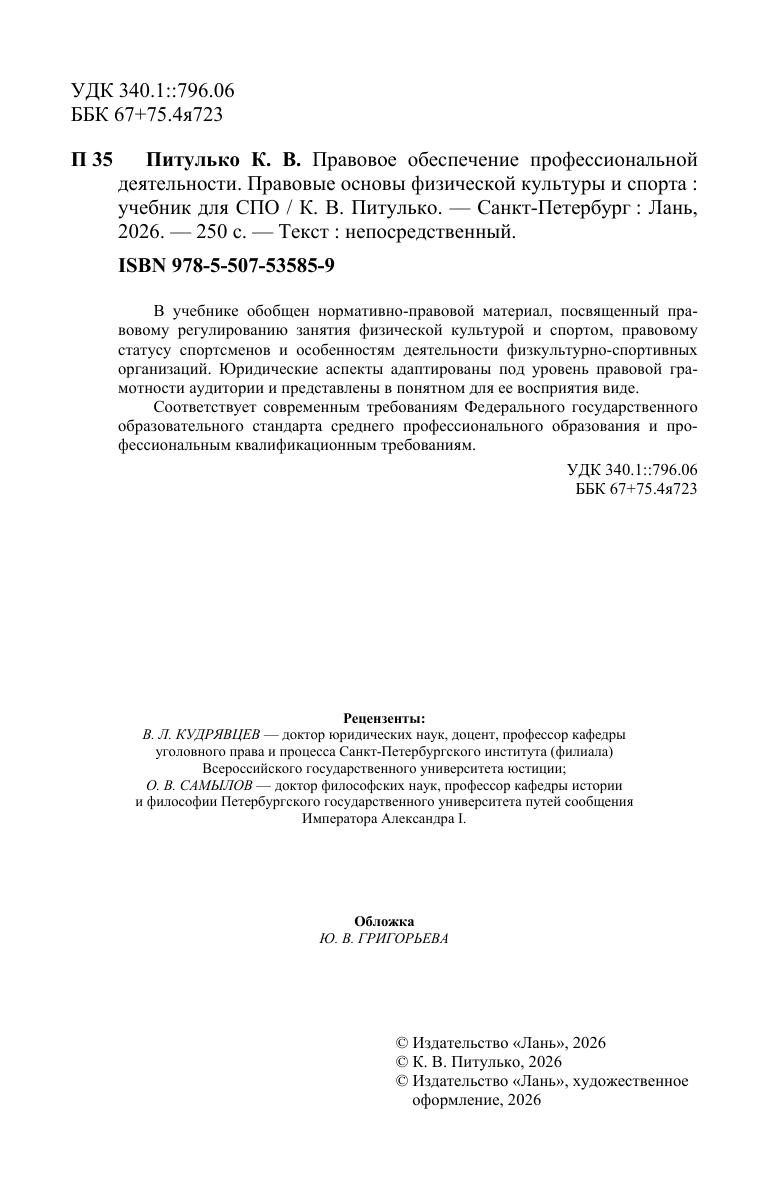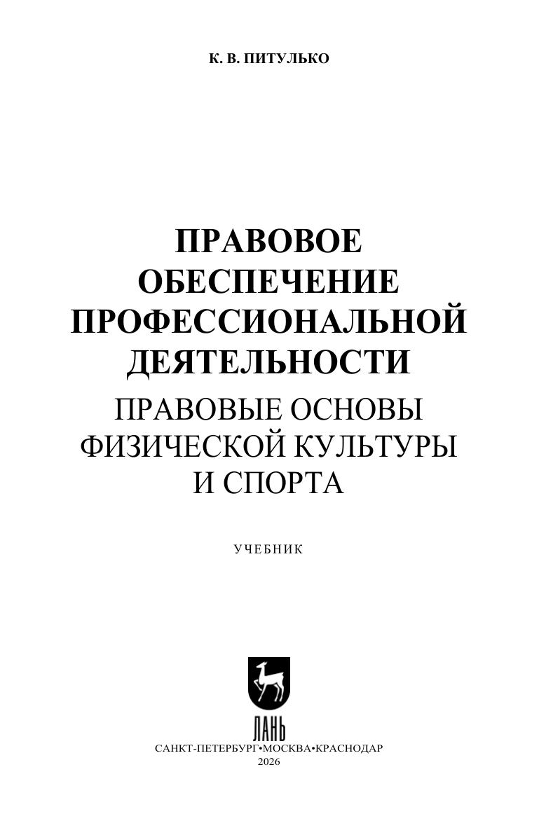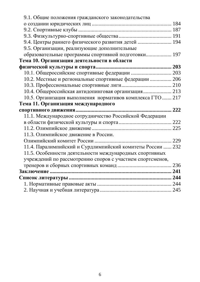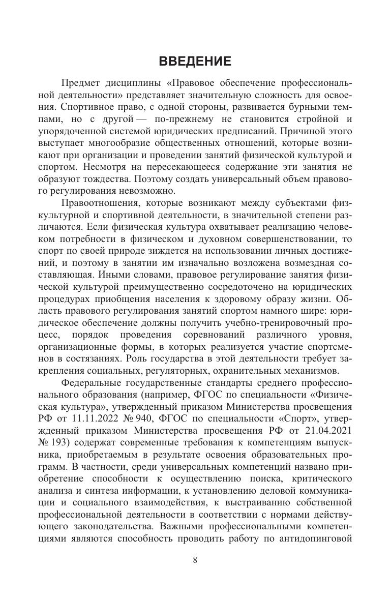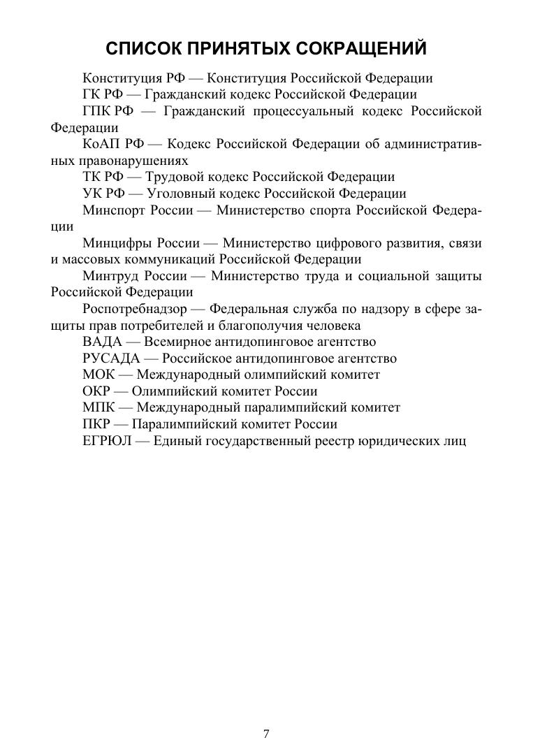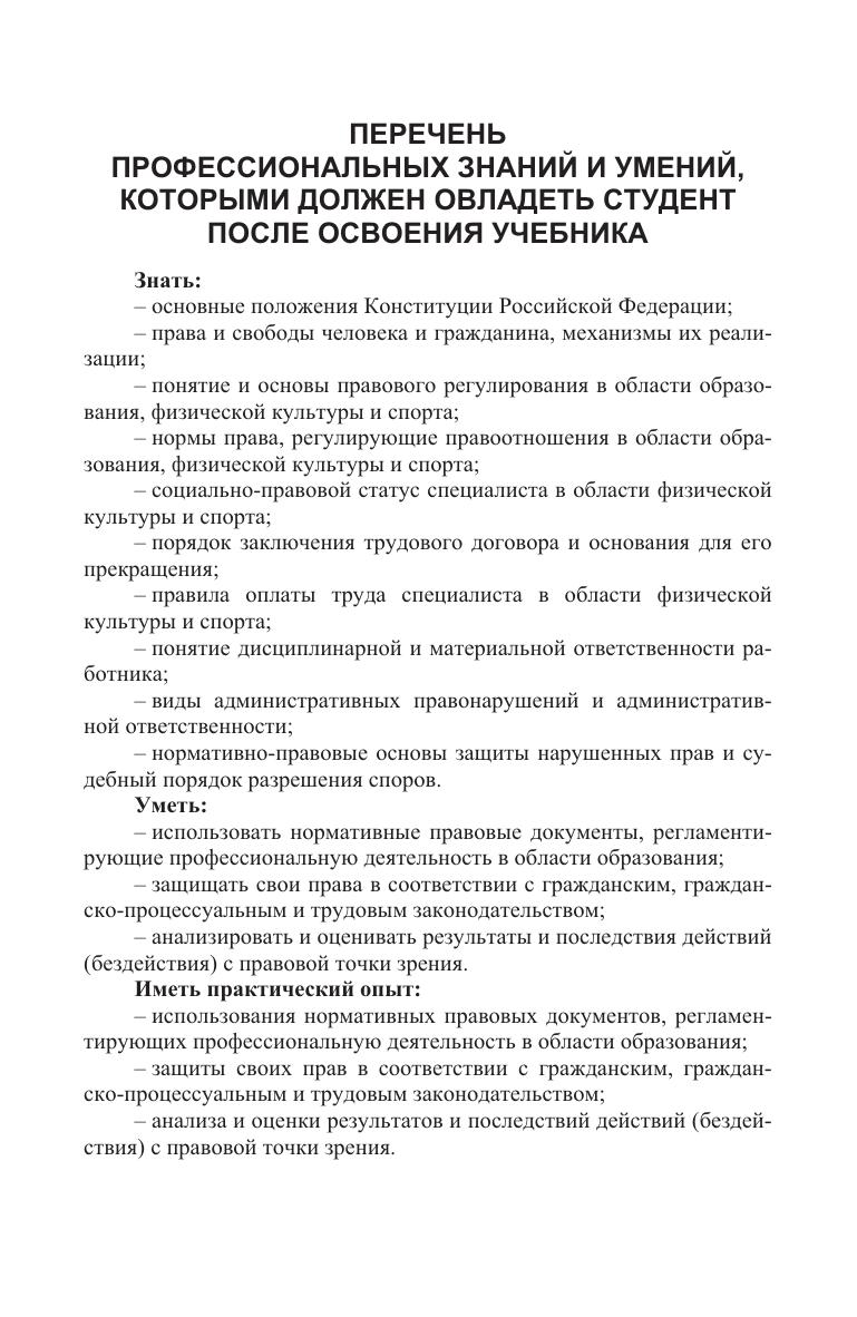 В учебнике обобщен нормативно-правовой материал, посвященный правовому регулированию занятия физической культурой и спортом, правовому статусу спортсменов и особенностям деятельности физкультурно-спортивных организаций. Юридические аспекты адаптированы под уровень правовой грамотности аудитории и представлены в понятном для ее восприятия виде. Соответствует современным требованиям Федерального государственного образовательного стандарта среднего профессионального образования и профессиональным квалификационным требованиям.