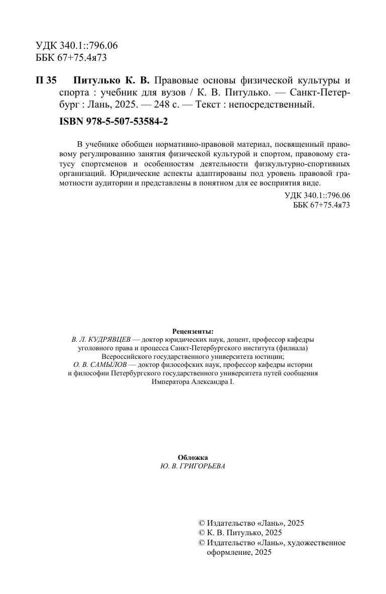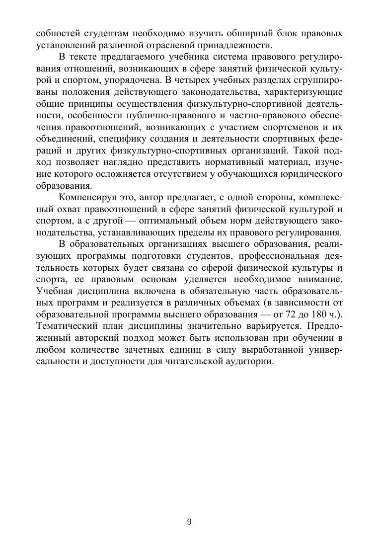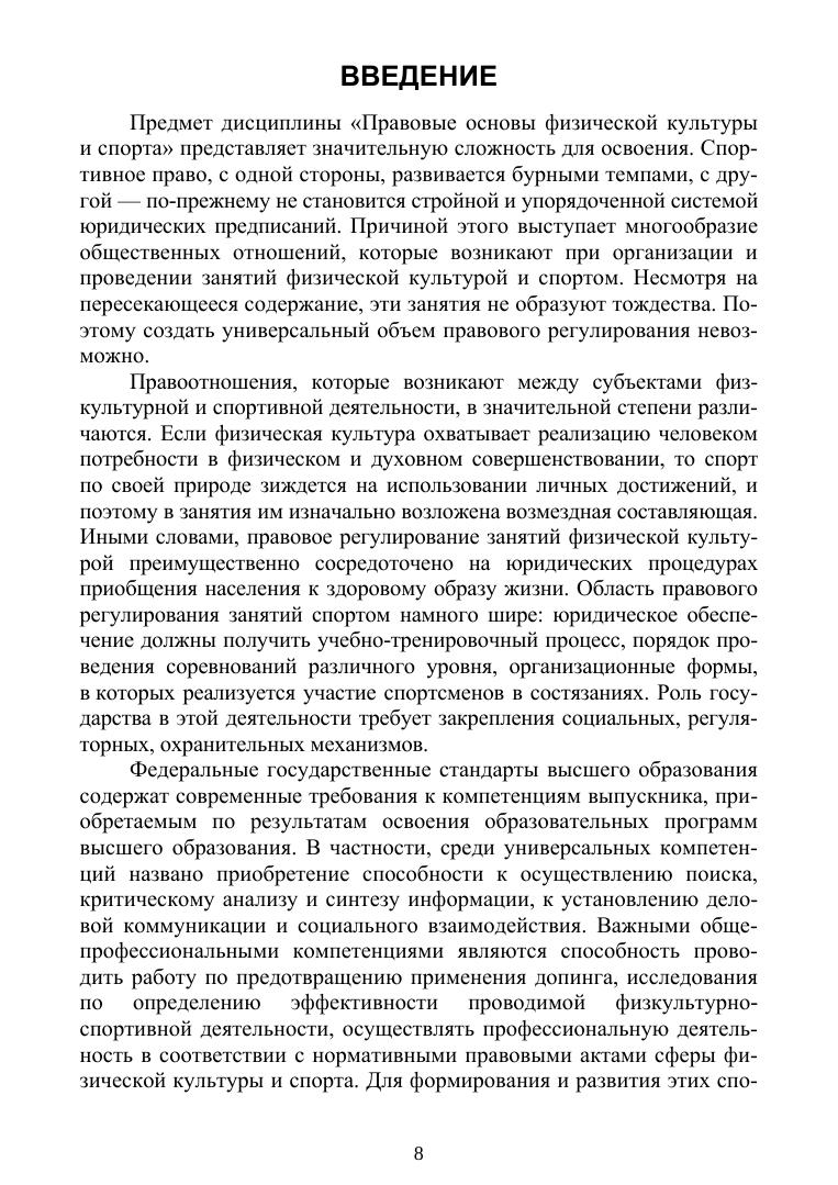 В учебнике обобщен нормативно-правовой материал, посвященный правовому регулированию занятия физической культурой и спортом, правовому статусу спортсменов и особенностям деятельности физкультурно-спортивных организаций. Юридические аспекты адаптированы под уровень правовой грамотности аудитории и представлены в понятном для ее восприятия виде.