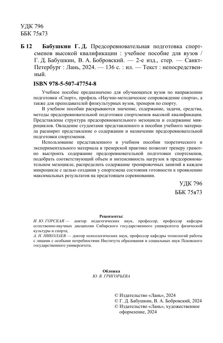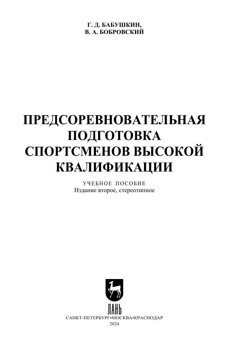 Учебное пособие предназначено для обучающихся вузов по направлению подготовки «Спорт», профиль «Научно-методическое сопровождение спорта», а также для преподавателей физкультурных вузов, тренеров по спорту. В учебном пособии раскрываются значение, содержание, задачи, средства, методы предсоревновательной подготовки спортсменов высокой квалификации. Представлены структура предсоревновательного мезоцикла и содержание микроциклов. Овладение студентами представленного в пособии учебного материала расширит представление о содержании и назначении предсоревновательной подготовки спортсменов. Использование представленного в учебном пособии теоретического и экспериментального материала в тренерской практике позволит тренеру грамотно выстроить содержание предсоревновательной подготовки спортсменов, подобрать соответствующий объем и интенсивность нагрузок в предсоревновательном мезоцикле, распределить содержание тренировочных занятий в каждом микроцикле с целью создания у спортсмена состояния готовности к проявлению максимальных результатов на предстоящем соревновании.