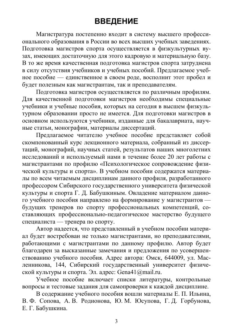 Учебное пособие предназначено для студентов, обучающихся в системе высшего профессионального образования. В учебном пособии излагается психолого-педагогическое сопровождение физического воспитания и спортивной тренировки. Приводится содержание работы учителя физической культуры по организации психологического сопровождения учебного процесса по физической культуре и спортивного тренера по организации психологического сопровождения тренировочного и соревновательного процессов. Учебное пособие включает следующие разделы: психодиагностика при занятиях физической культурой и спортом, психология общения в сфере физической культуры и спорта, психология управления в спорте, психорегуляция при занятиях физической культурой и спортом, психологическое сопровождение физического воспитания, психологическое обеспечение занятий спортом, конфликты в сфере физической культуры и спорта, психологическая совместимость и срабатываемость в спортивной деятельности, психология соревновательной деятельности, мотивация физкультурно-спортивной деятельности. В содержание учебного пособия включены современные научные данные, освещающие психологическое сопровождение физического воспитания и спортивной подготовки. Каждый раздел учебного пособия включает: тестовые задания для проверки знаний, контрольные вопросы и задания, список литературы.
