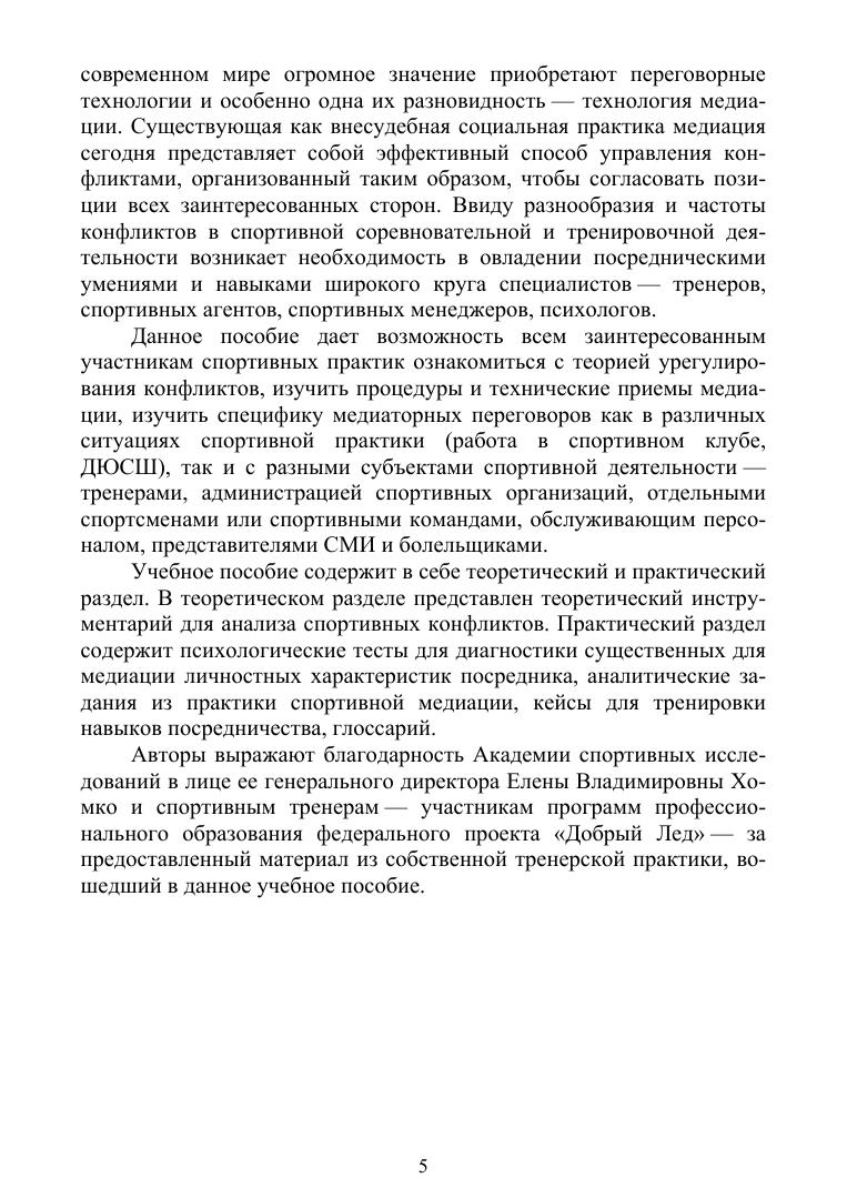 Учебное пособие дает возможность всем заинтересованным участникам спортивных практик ознакомиться с теорией урегулирования конфликтов, изучить процедуры и технические приемы медиации, изучить специфику медиаторных переговоров как в различных ситуациях спортивной практики, так и с разными субъектами спортивной деятельности — тренерами, администрацией спортивных организаций, отдельными спортсменами или спортивными командами, обслуживающим персоналом, представителями СМИ и болельщиками. Соответствует современным требованиям Федерального государственного образовательного стандарта среднего профессионального образования и профессиональным квалификационным требованиям.