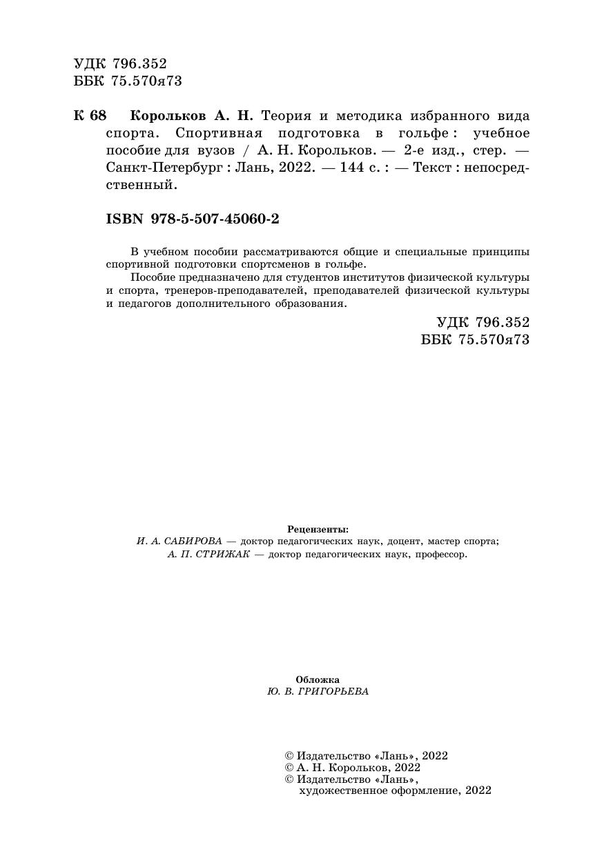 В учебном пособии рассматриваются общие и специальные принципы спортивной подготовки спортсменов в гольфе, Пособие предназначено для студентов институтов физической культуры и спорта, тренеров-преподавателей, преподавателей физической культуры и педагогов дополнительного образования.