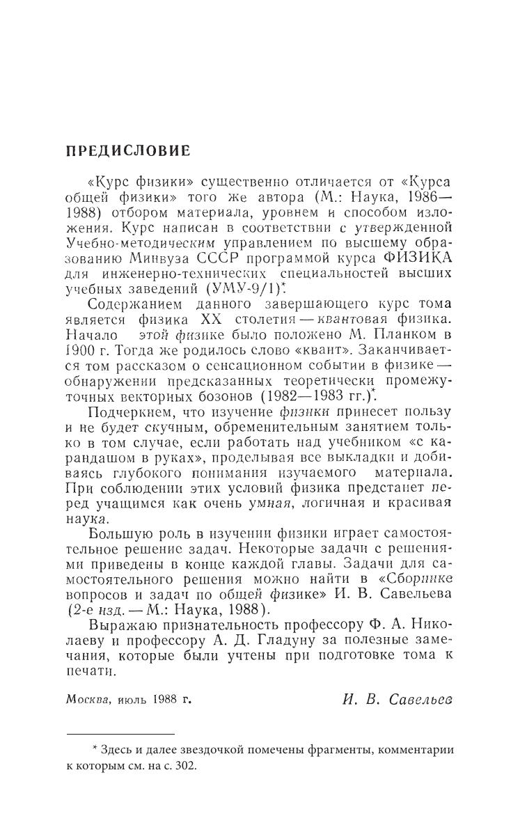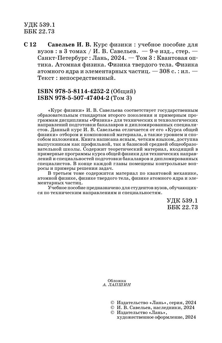 Курс физики И.В. Савельева соответствует государственным образовательным стандартам второго поколения и примерным программам дисциплины "Физика" для технических и технологических направлений подготовки бакалавров и дипломированных специалистов. Данный курс И.В. Савельева отличается от его "Курса общей физики" отбором и компоновкой материала, а также уровнем и способом изложения. Книга написана ясным, четким языком, доступна выпускникам как профильной, так и базисной средней общеобразовательной школы. Содержит теоретический материал, входящий в примерные программы общей физики для технических направлений и специальности подготовки бакалавров и дипломированных специалистов. В конце каждой главы помещены контрольные вопросы и примеры решения задач. В третьем томе содержится материал по квантовой механике, атомной физике, физике твердого тела, физике атомного ядра и элементарных частиц. Учебное пособие предназначено для студентов вузов, обучающихся по техническим направлениям и специальностям