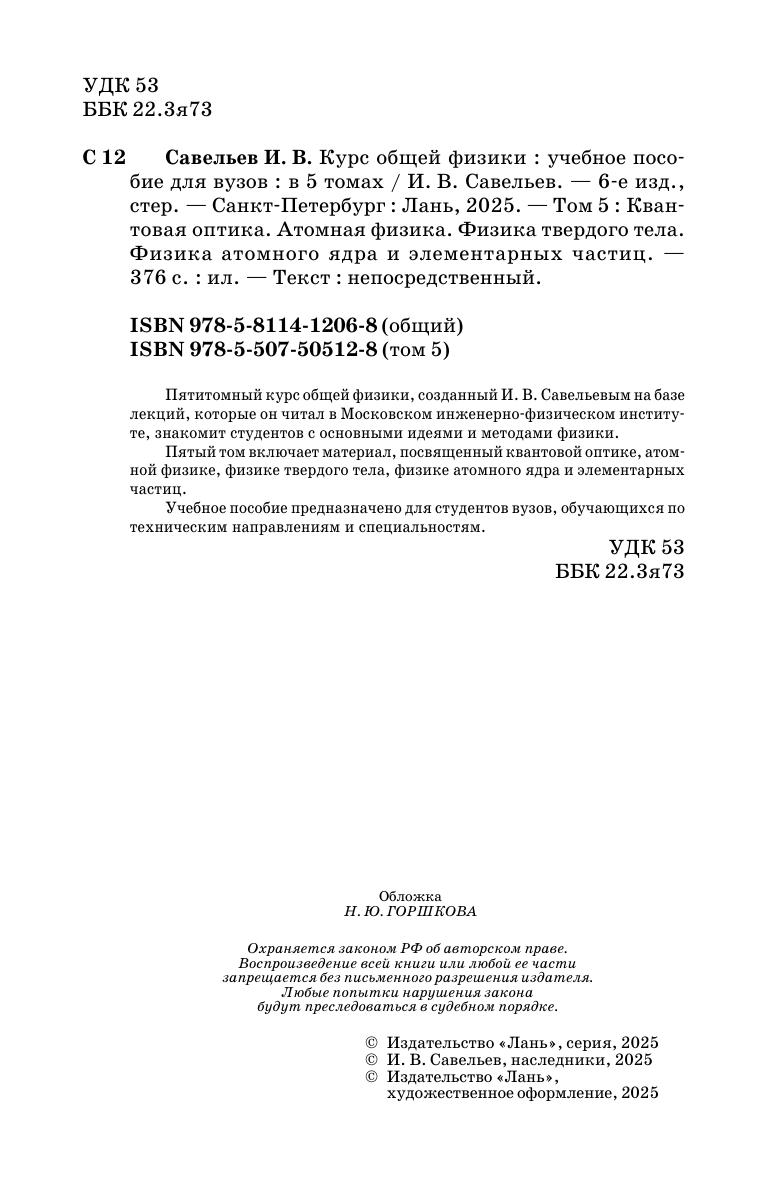 Пятитомный курс общей физики, созданный И. В. Савельевым на базе лекций, которые он читал в Московском инженерно-физическом институте, знакомит студентов с основными идеями и методами физики. Первый том содержит изложение материала по механике (кинематика, динамика, законы сохранения, гравитация, колебательное движение, гидродинамика). Второй том включает материал, посвященный электричеству и магнетизму. Третий том включает материал, посвященный молекулярной физике и термодинамике. Четвертый том включает материал, посвященный волнам и оптике. Пятый том включает материал, посвященный квантовой оптике, атомной физике, физике твердого тела, физике атомного ядра и элементарных частиц. Учебное пособие предназначено для студентов вузов, обучающихся по техническим направлениям и специальностям.