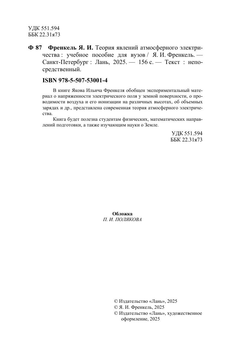 В книге Якова Ильича Френкеля обобщен экспериментальный материал о напряженности электрического поля у земной поверхности, о проводимости воздуха и его ионизации на различных высотах, об объемных зарядах и др., представлена современная теория атмосферного электричества. Книга будет полезна студентам физических, математических направлений подготовки, а также изучающим науки о Земле.