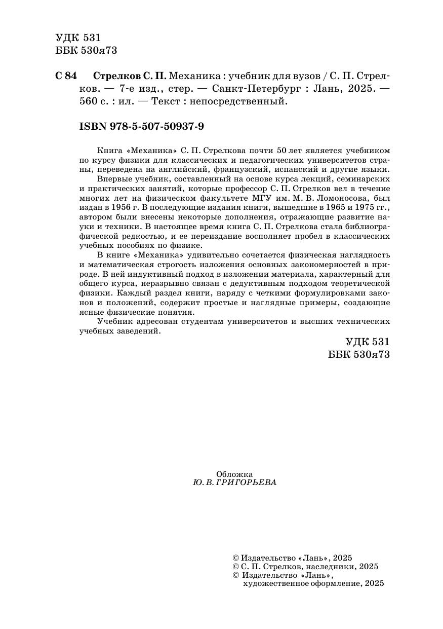 Книга «Механика» С. П. Стрелкова почти 50 лет является учебным пособием по курсу физики для классических и педагогических университетов страны, переведена на английский, французский, испанский и другие языки. Впервые учебное пособие, составленное на основе курса лекций, семинарских и практических занятий, которые профессор С. П. Стрелков вел в течение многих лет на физическом факультете МГУ им. М. В. Ломоносова, было издано в 1956 г. В последующие издания книги, вышедшие в 1965 и 1975 гг., автором были внесены некоторые дополнения, отражающие развитие науки и техники. В настоящее время книга С. П. Стрелкова стала библиографической редкостью, и ее переиздание восполняет пробел в классических учебных пособиях по физике. В книге «Механика» удивительно сочетается физическая наглядность и математическая строгость изложения основных закономерностей в природе. В ней индуктивный подход в изложении материала, характерный для общего курса, неразрывно связан с дедуктивным подходом теоретической физики. Каждый раздел книги, наряду с четкими формулировками законов и положений, содержит простые и наглядные примеры, создающие ясные физические понятия.