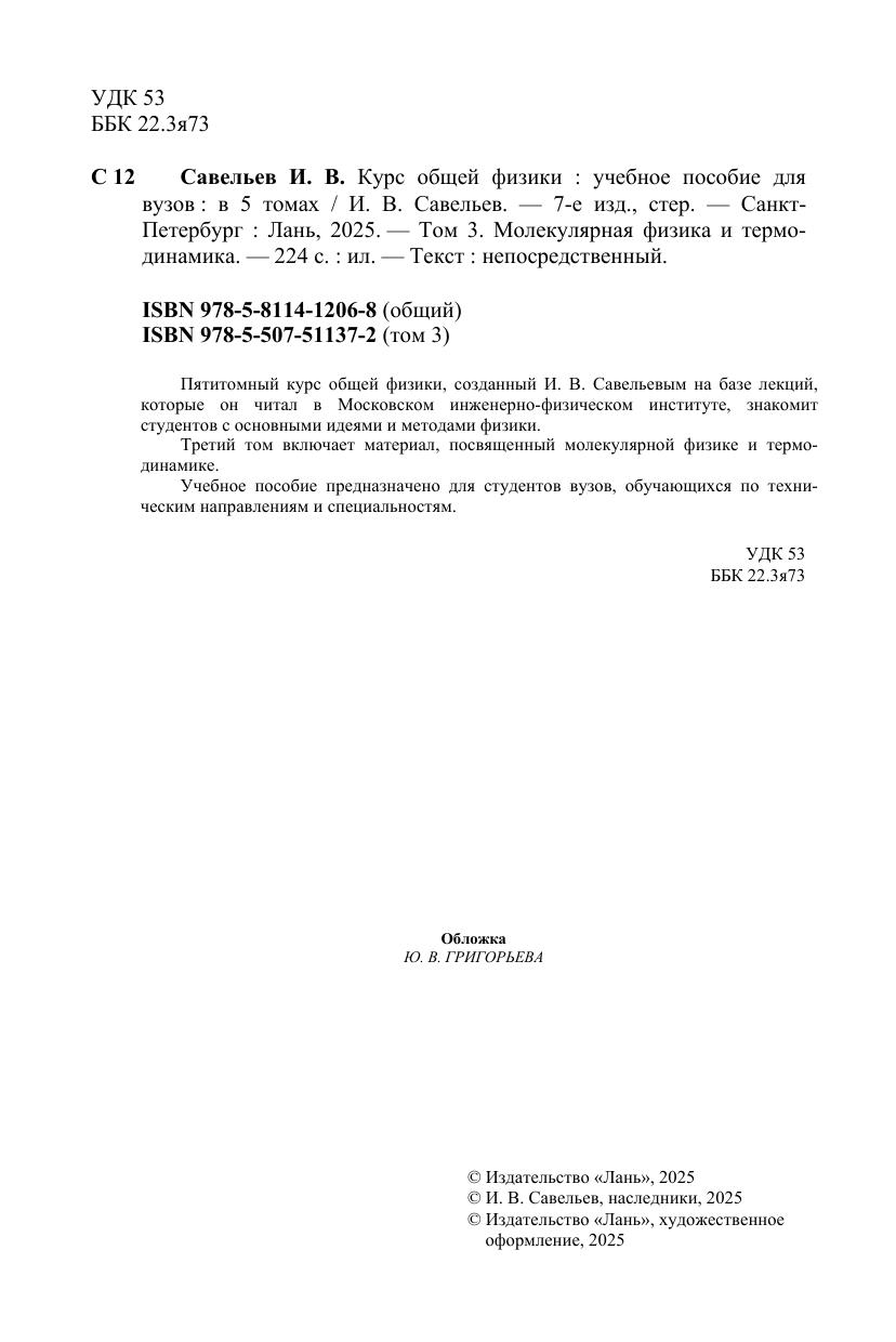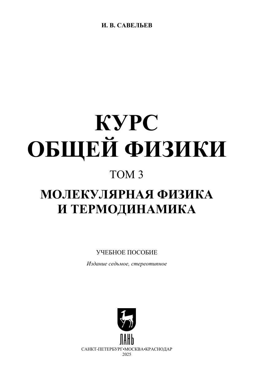 Пятитомный курс общей физики, созданный И. В. Савельевым на базе лекций, которые он читал в Московском инженерно-физическом институте, знакомит студентов с основными идеями и методами физики. Третий том включает материал, посвященный молекулярной физике и термодинамике. Учебное пособие предназначено для студентов вузов, обучающихся по техническим направлениям и специальностям.