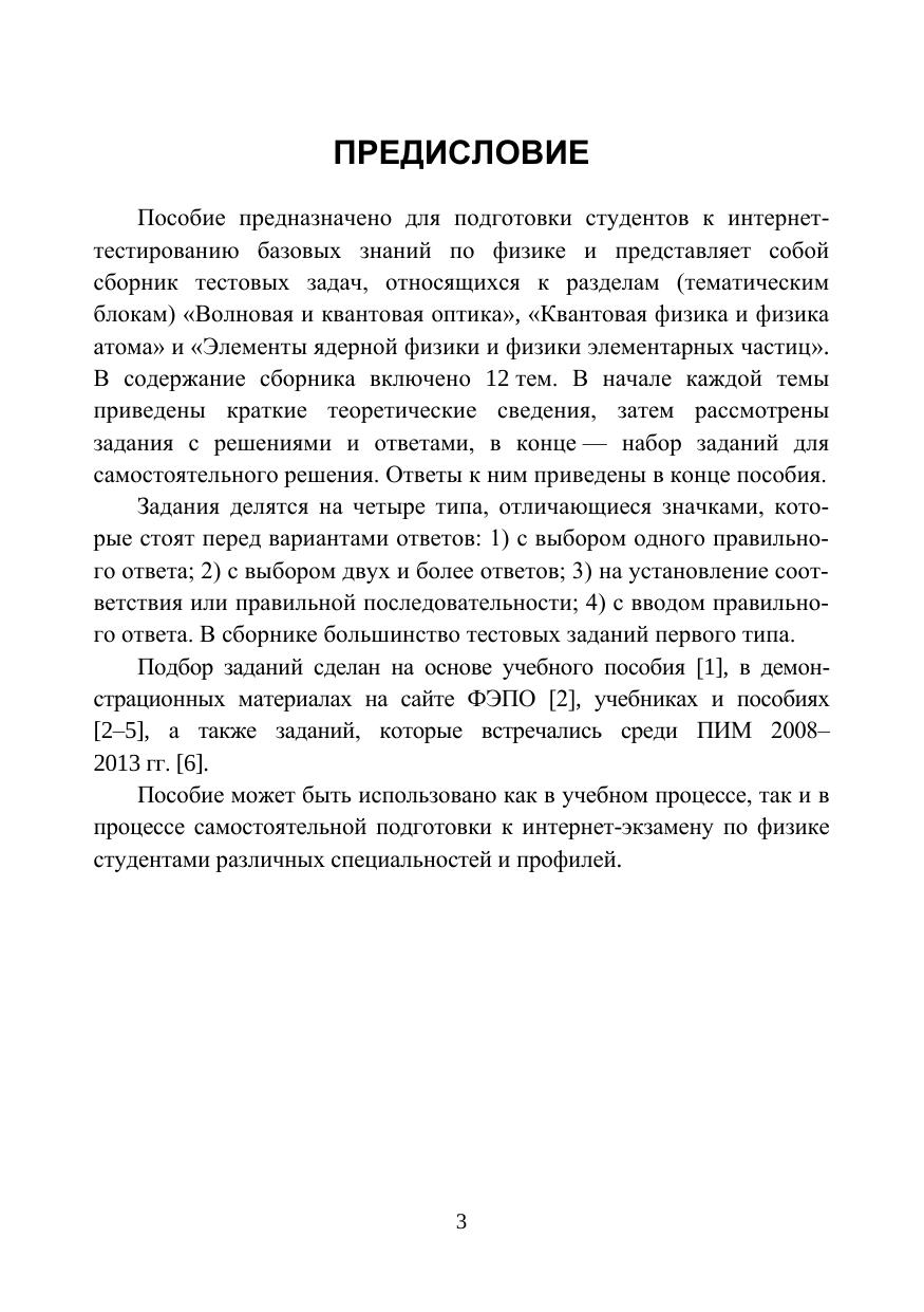 Учебное пособие предназначено для подготовки к интернет-тестированию по физике, которое проводится в рамках ежегодного мониторинга качества учебного процесса учреждений высшего профессионального образования. Рассмотрены такие разделы учебного курса, как «Волновая и квантовая оптика», «Квантовая физика и физика атома» и «Элементы ядерной физики и физики элементарных частиц». Пособие может быть использовано как в учебном процессе, так и в процессе самостоятельной подготовки студентами к интернет-экзамену по физике.