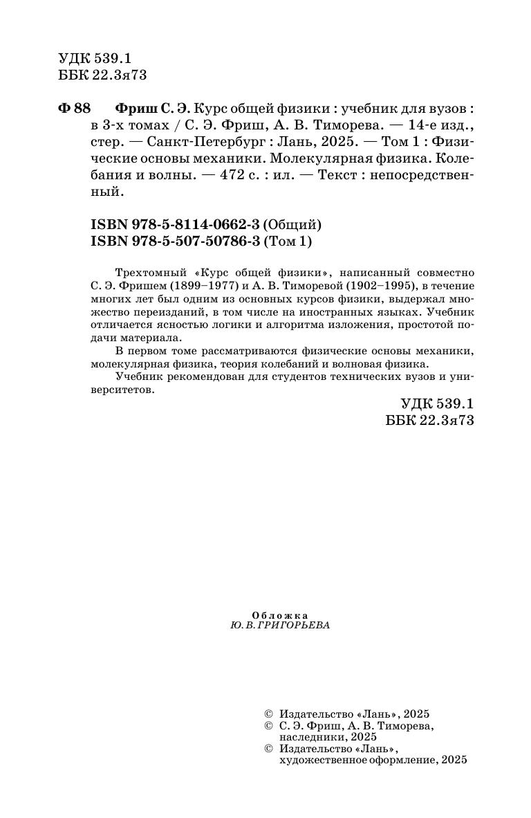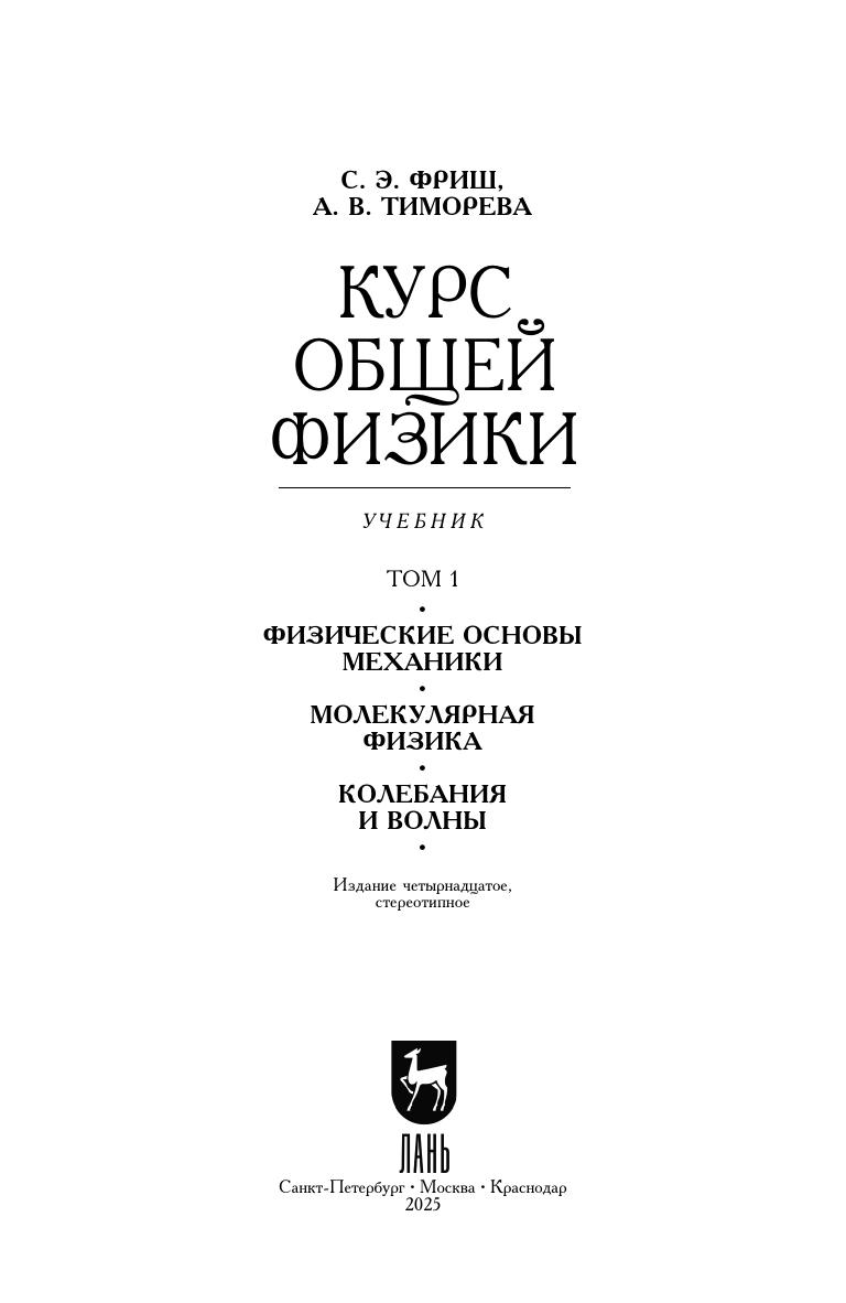 Учебник рекомендован для студентов технических вузов и университетов. Трехтомный "Курс общей физики", написанный совместно с С. Э. Фришем (1899–1977) и А. В. Тимаревой (1902–1995), в течении многих лет был одним из основных курсов физики, выдержал множество переизданий, в том числе на иностранных языках. Учебник отличается ясностью логики и алгоритмами изложения, простотой подачи материала. В первом томе рассматриваются физические основы механики, молекулярная физика, теория колебаний и волновая физика.