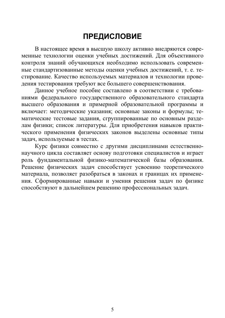 Учебное пособие составлено в соответствии с требованиями Федерального государственного образовательного стандарта высшего образования и примерной образовательной программы и включает методические указания, основные законы и формулы, тематические тестовые задания, сгруппированные по основным разделам физики, список литературы. Для приобретения навыков практического применения физических законов выделены основные типы задач, используемые в тестах.