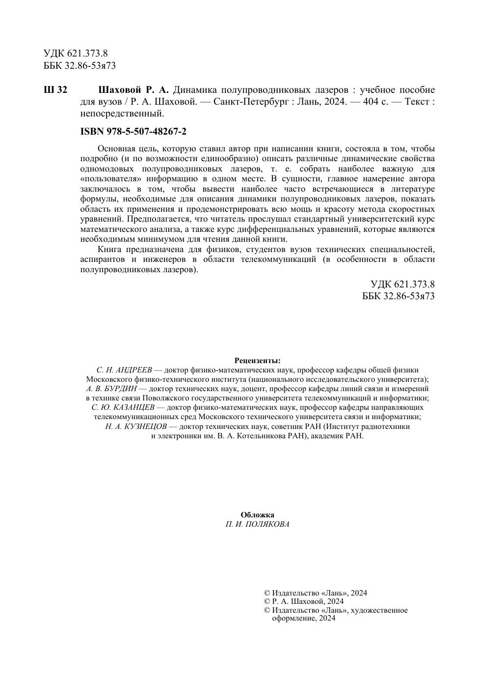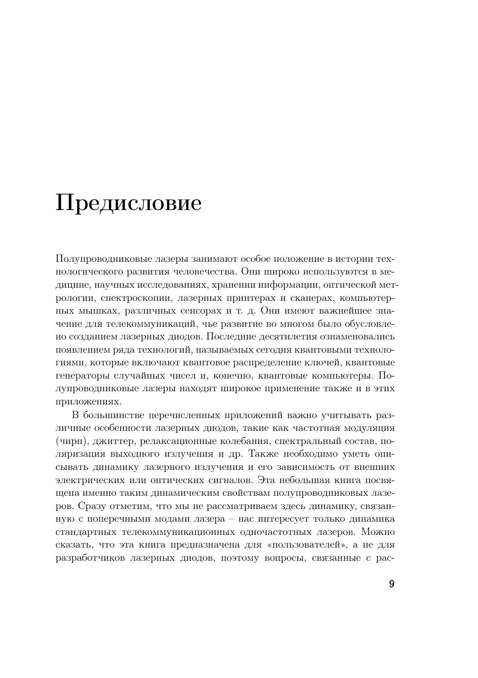 Основная цель, которую ставил автор при написании книги, состояла в том, чтобы подробно (и по возможности единообразно) описать различные динамические свойства одномодовых полупроводниковых лазеров, т. е. собрать наиболее важную для «пользователя» информацию в одном месте. В сущности, главное намерение автора заключалось в том, чтобы вывести наиболее часто встречающиеся в литературе формулы, необходимые для описания динамики полупроводниковых лазеров, показать область их применения и продемонстрировать всю мощь и красоту метода скоростных уравнений. Предполагается, что читатель прослушал стандартный университетский курс математического анализа, а также курс дифференциальных уравнений, которые являются необходимым минимумом для чтения данной книги. Книга предназначена для физиков, студентов вузов технических специальностей, аспирантов и инженеров в области телекоммуникаций (в особенности в области полупроводниковых лазеров).