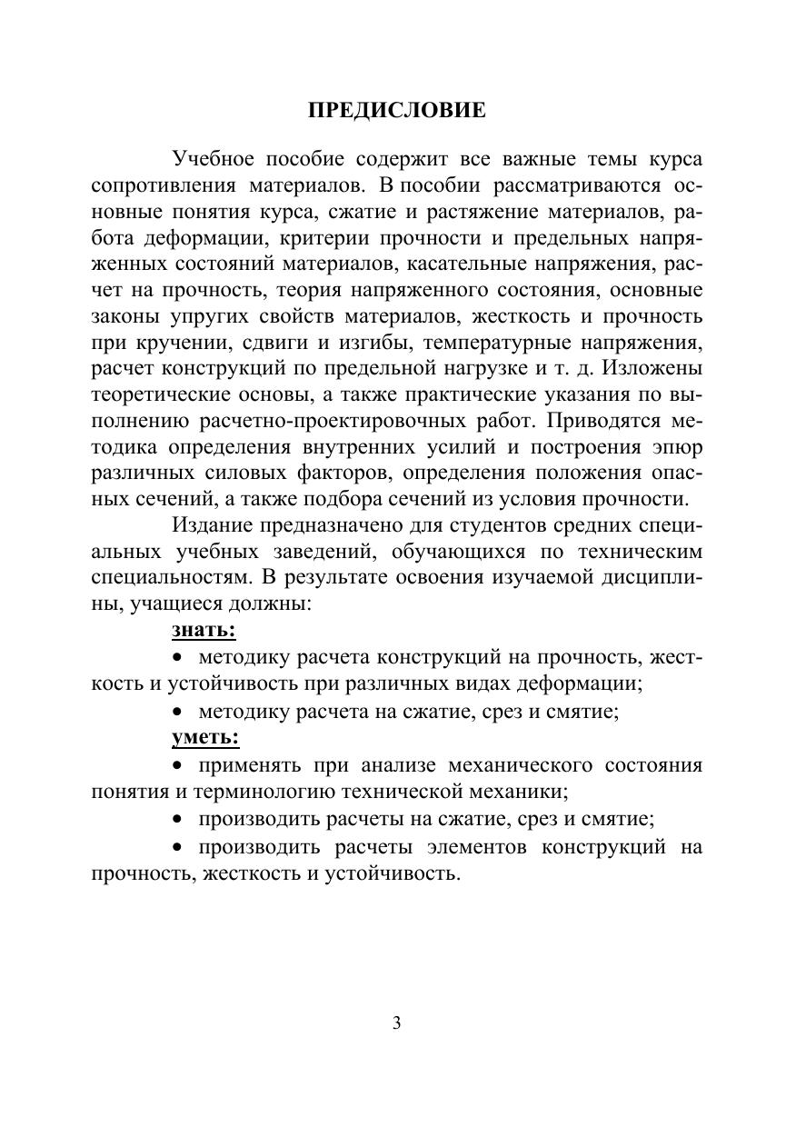 В учебном пособии изложены теоретические основы, а также практические указания по выполнению расчетно-проектировочных работ. Приводятся методика определения внутренних усилий и построения эпюр различных силовых факторов, определения положения опасных сечений, а также подбора сечений из условия прочности. Соответствует современным требованиям Федерального государственного образовательного стандарта среднего профессионального образования и профессиональным квалификационным требованиям. Предназначено для учащихся средних специальных учебных заведений, обучающихся по техническим специальностям.
