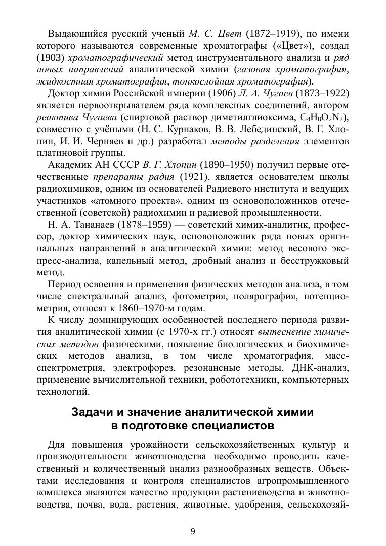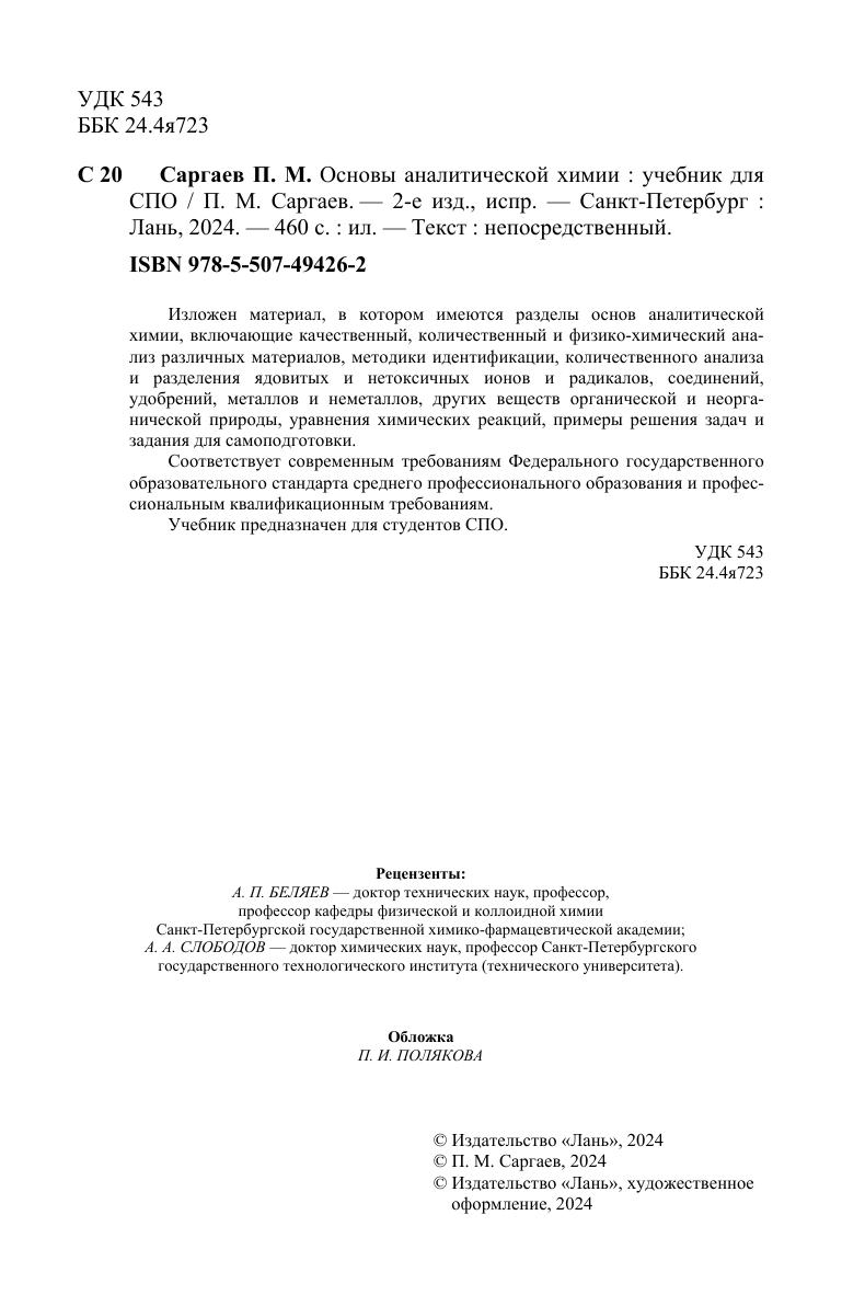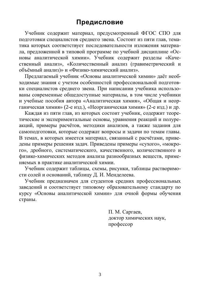 Изложен материал, в котором имеются разделы основ аналитической химии, включающие качественный, количественный и физико-химический анализ различных материалов, методики идентификации, количественного анализа и разделения ядовитых и нетоксичных ионов и радикалов, соединений, удобрений, металлов и неметаллов, других веществ органической и неорганической природы, уравнения химических реакций, примеры решения задач и задания для самоподготовки. Соответствует современным требованиям Федерального государственного образовательного стандарта среднего профессионального образования и профессиональным квалификационным требованиям. Учебник предназначен для студентов СПО.