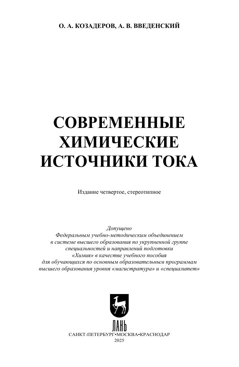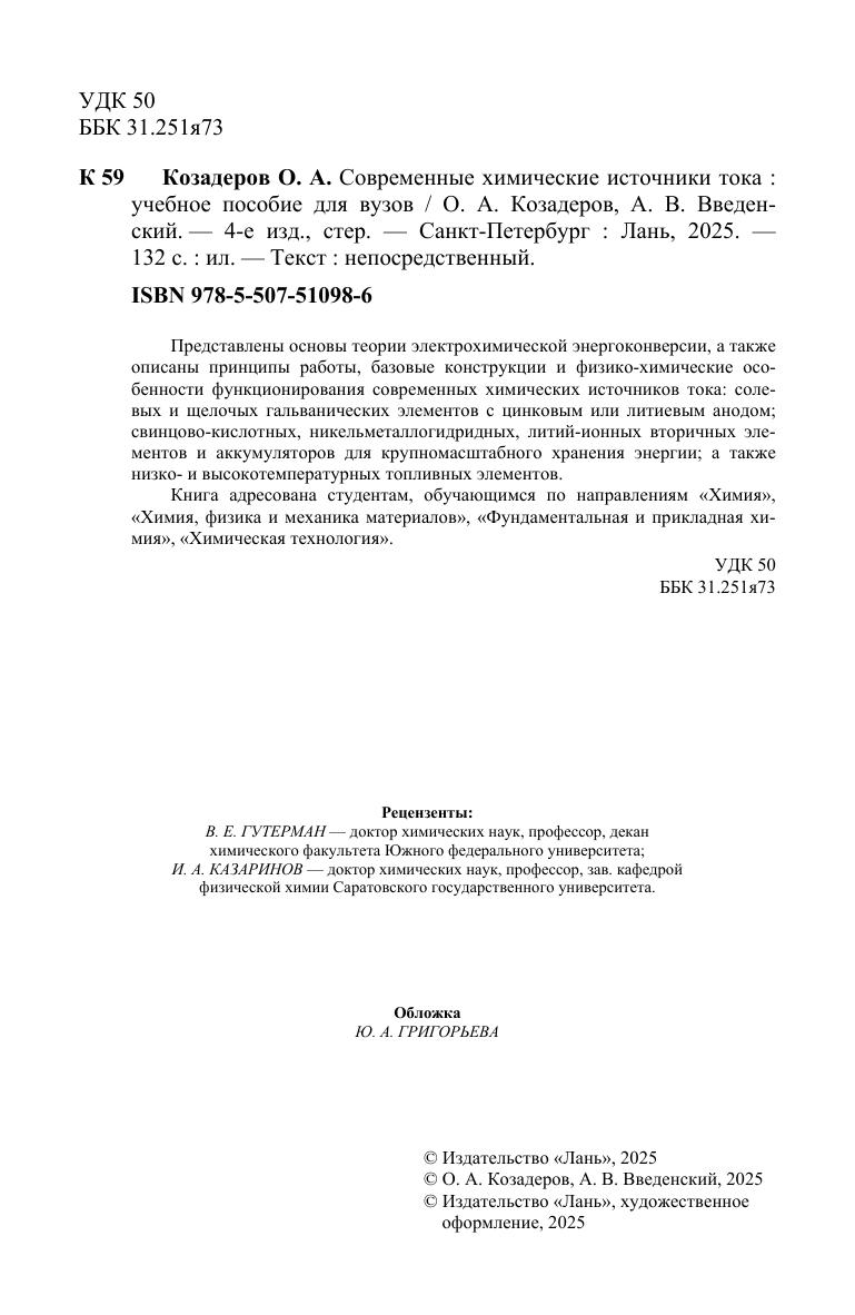 Представлены основы теории электрохимической энергоконверсии, а также описаны принципы работы, базовые конструкции и физико-химические особенности функционирования современных химических источников тока: солевых и щелочых гальванических элементов с цинковым или литиевым анодом, свинцово-кислотных, никельметаллогидридных, литий-ионных вторичных элементов и аккумуляторов для крупномасштабного хранения энергии, а также низко- и высокотемпературных топливных элементов. Книга адресована студентам, обучающимся по направлениям «Химия», «Химия, физика и механика материалов», «Фундаментальная и прикладная химия», «Химическая технология».