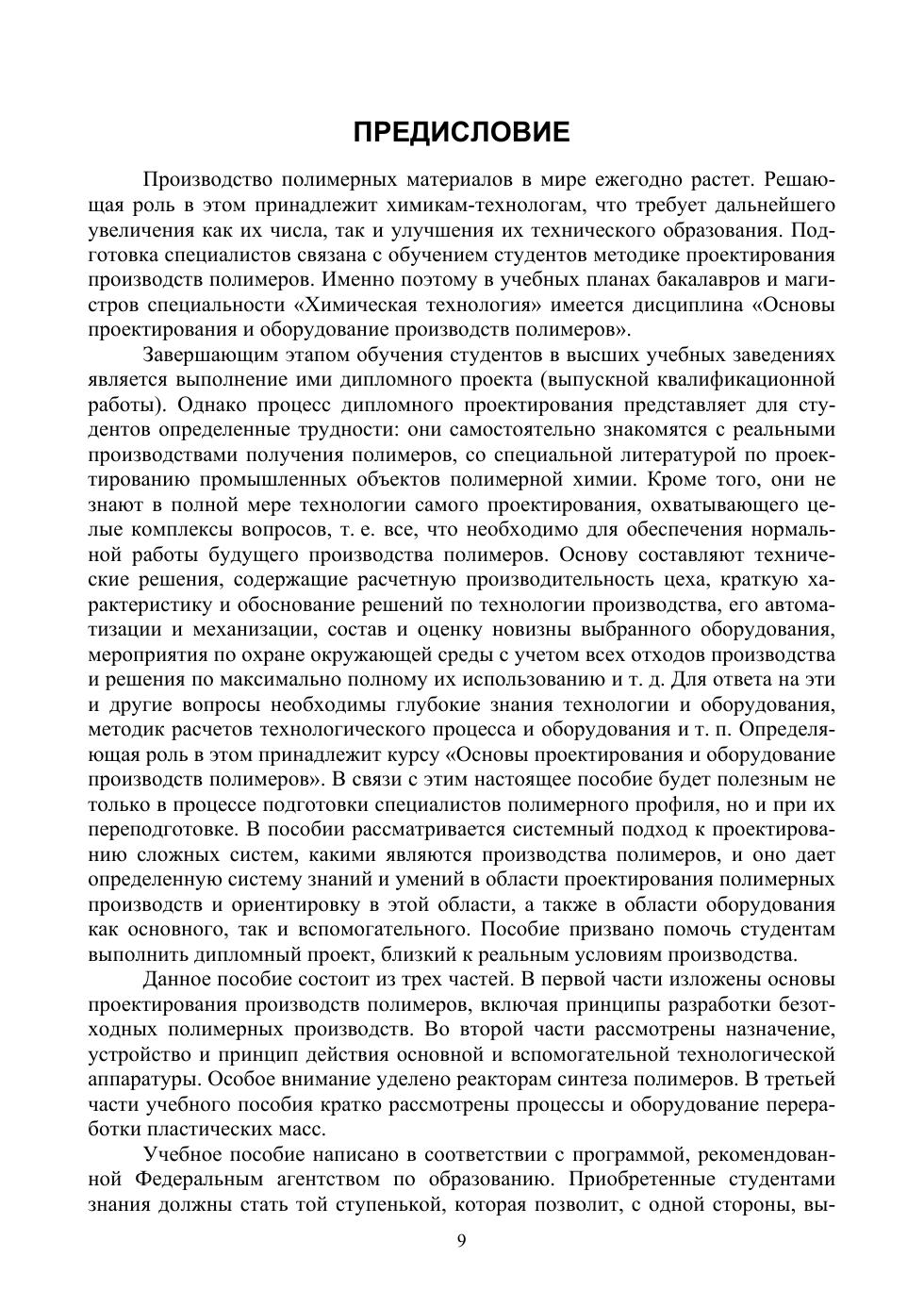 В учебном пособии рассмотрены вопросы проектирования производств полимерной химии, разработки проектной документации, технологических схем и другие вопросы, возникающие в процессе проектирования. Большое внимание уделено составлению и расчету материальных и тепловых балансов проектируемых производств, а также конструированию и расчету реакционных устройств полимеризации и поликонденсации. Рассмотрено основное и вспомогательное оборудование заводов полимерной химии. Показаны конструктивные особенности реакторов для производства пластических масс, влияние метода изготовления на их конструкцию, а также рассмотрены детали, применяемые при изготовлении основной и вспомогательной аппаратуры. Описаны устройство и принципы действия оборудования для переработки полимерных материалов. Учебное пособие предназначено для бакалавров и магистров высших учебных заведений, обучающихся по направлению «Химическая технология». Кроме того, оно может служить практическим руководством для инженерно-технических работников предприятий, производящих высокомолекулярные соединения и пластические массы на их основе.