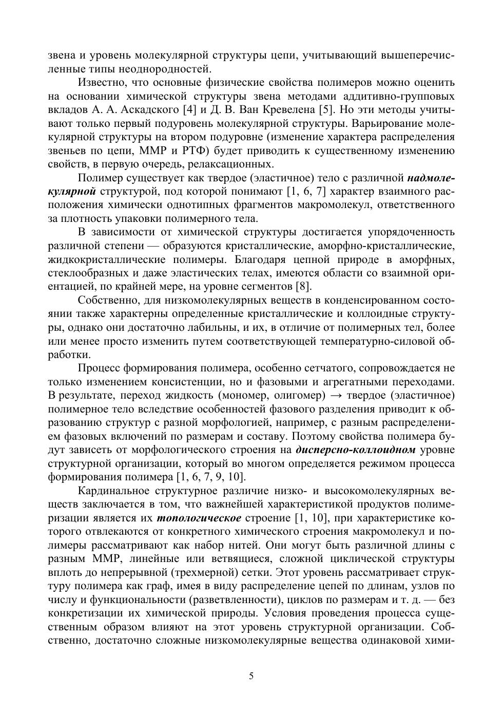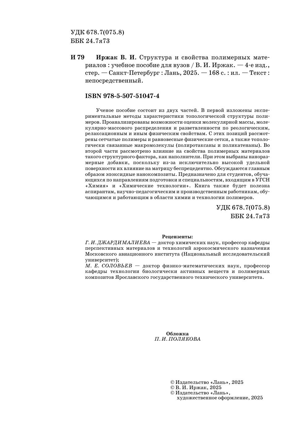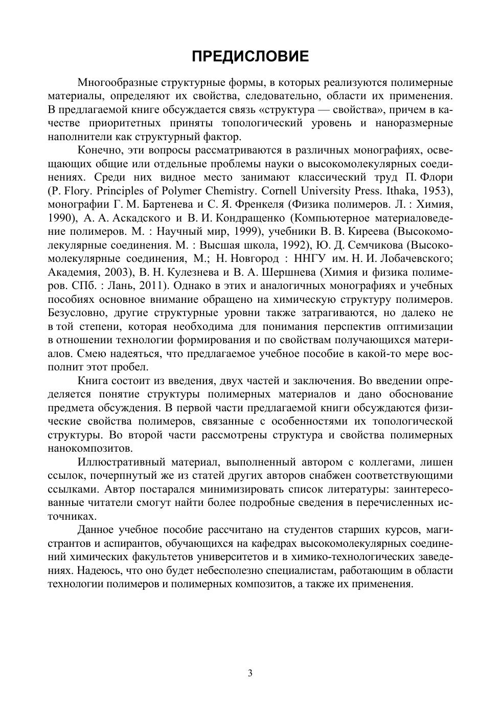 Ученое пособие состоит из двух частей. В первой изложены экспериментальные методы характеристики топологической структуры полимеров. Проанализированы возможности оценки молекулярной массы, молекулярно-массового распределения и разветвленности по реологическим, релаксационным и иным физическим свойствам. С этих позиций рассмотрены сетчатые полимеры и равновесные физические сетки, а также топологически связанные макромолекулы (полиротаксаны и поликатенаны). Во второй части рассмотрено влияние на свойства полимерных материалов такого структурного фактора как наполнители. При этом выбраны наноразмерные добавки, поскольку из-за исключительно высокой удельной поверхности их влияние на матрицу беспрецедентно. Обсуждаются, главным образом, эпоксидные нанокомпозиты. Предназначено для студентов, обучающихся по направлениям подготовки и специальностям, входящим в УГСН «Химия» и «Химические технологии». Книга также будет полезна аспирантам, научно-педагогическим и производственным работникам, обучающихся и работающих в области химии и технологии полимеров.