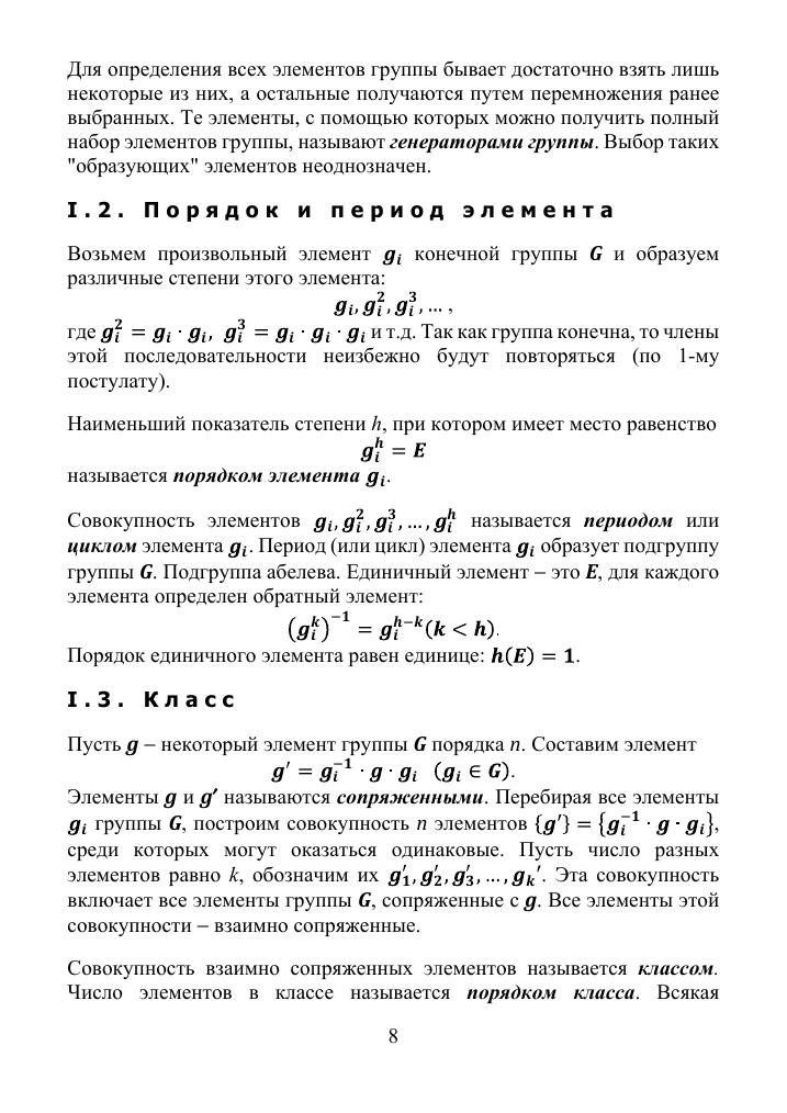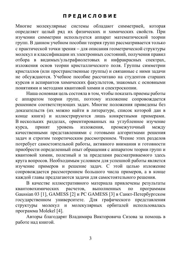 Изложены основы теоретико-группового анализа геометрического и электронного строения молекулярных систем. Даны необходимые вводные сведения из теории групп. Аппарат теории групп рассматривается как основа классификации электронных состояний молекул. Рассмотрено приложение теоретико-групповых методов к задачам колебательной и электронной спектроскопии. Показана роль этих методов в теории кристаллического поля. Особое внимание уделено прикладным вопросам, многочисленные примеры позволяют не только познакомиться с общими представлениями, но и научиться пользоваться излагаемым материалом. В конце каждой главы предлагаются задачи для самостоятельной работы.Учебное пособие рассчитано на студентов и аспирантов химических факультетов университетов.