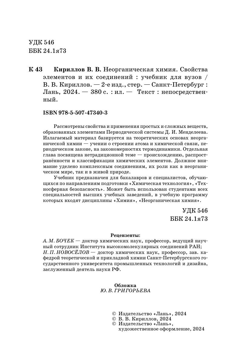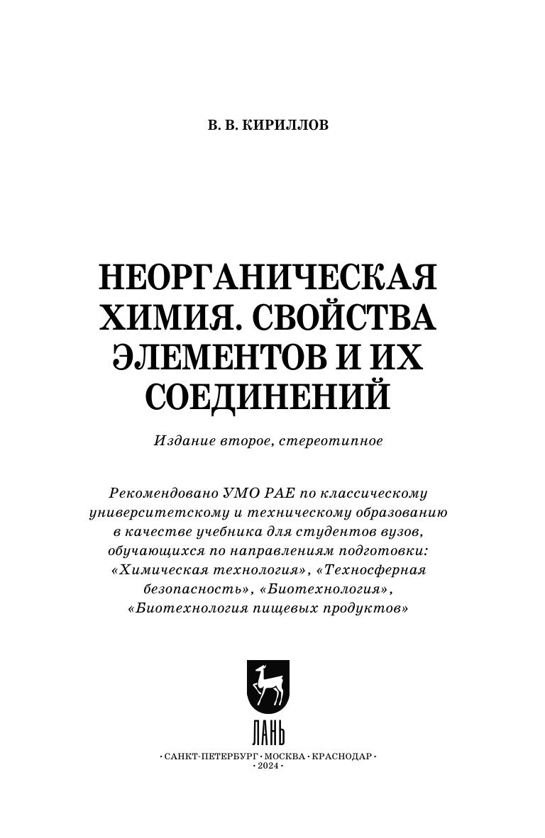 Рассмотрены свойства и применения простых и сложных веществ, образованных элементами Периодической системы Д. И. Менделеева. Излагаемый материал базируется на теоретических основах неорганической химии — учении о строении атома и химической связи, периодическом законе, на закономерностях термодинамики. Отдельная глава посвящена нетрадиционной теме — происхождению, распространённости и классификации химических элементов. Должное внимание уделено комплексным соединениям, их роли как в неорганическом мире, так и в живой природе. Учебник предназначен для бакалавров и специалистов, обучающихся по направлениям подготовки «Химическая технология», «Техносферная безопасность». Может быть использован студентами всех специальностей высших учебных заведений, в учебную программу которых входят дисциплины «Химия», «Неорганическая химия».