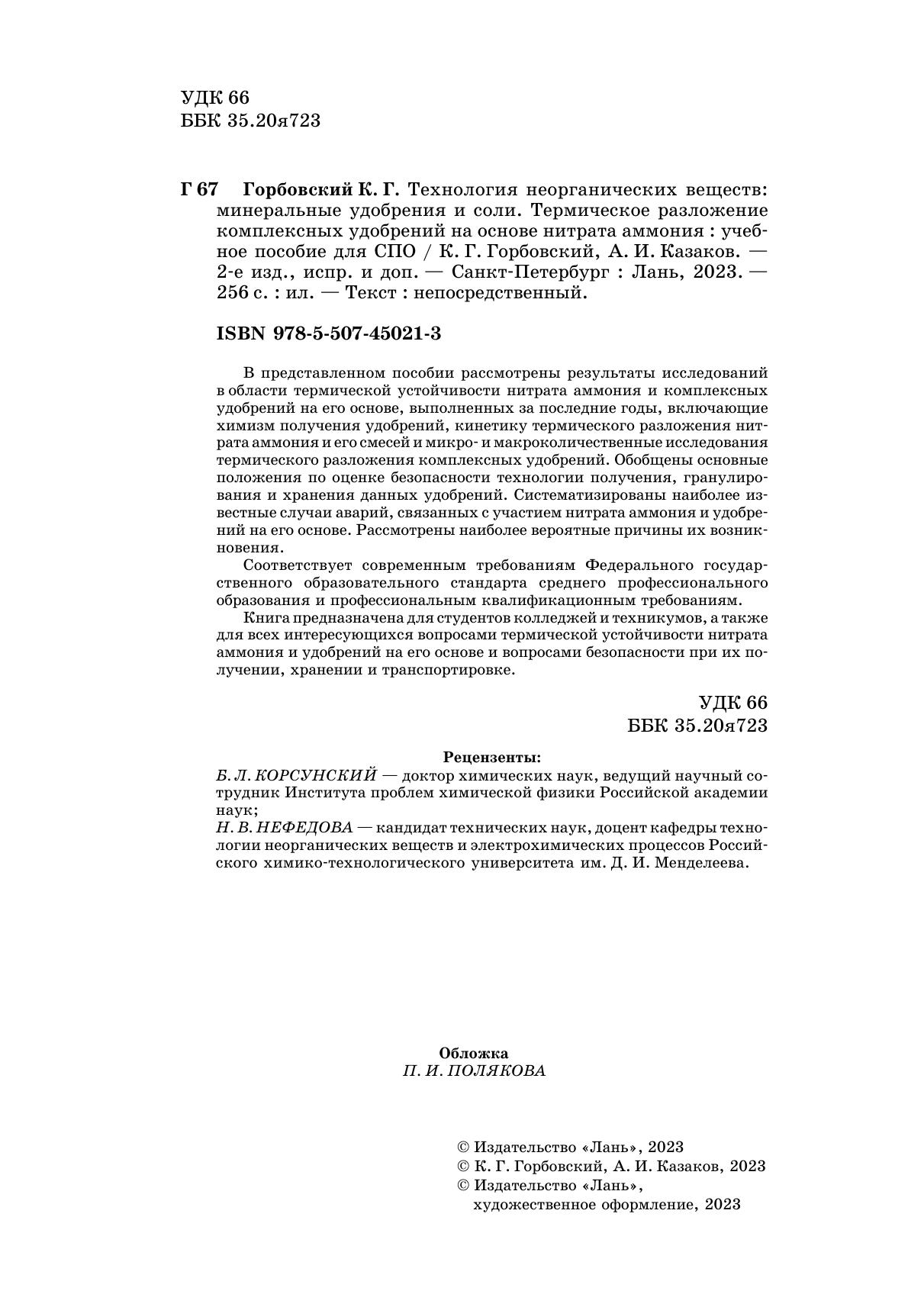В представленном пособии рассмотрены результаты исследований в области термической устойчивости нитрата аммония и комплексных удобрений на его основе, выполненных за последние годы, включающие химизм получения удобрений, кинетику термического разложения нитрата аммония и его смесей и микро- и макроколичественные исследования термического разложения комплексных удобрений. Обобщены основные положения по оценке безопасности технологии получения, гранулирования и хранения данных удобрений. Систематизированы наиболее известные случаи аварий, связанных с участием нитрата аммония и удобрений на его основе. Рассмотрены наиболее вероятные причины их возникновения. Соответствует современным требованиям Федерального государственного образовательного стандарта среднего профессионального образования и профессиональным квалификационным требованиям. Книга предназначена для студентов колледжей и техникумов, а также для всех интересующихся вопросами термической устойчивости нитрата аммония и удобрений на его основе и вопросами безопасности при их получении, хранении и транспортировке.