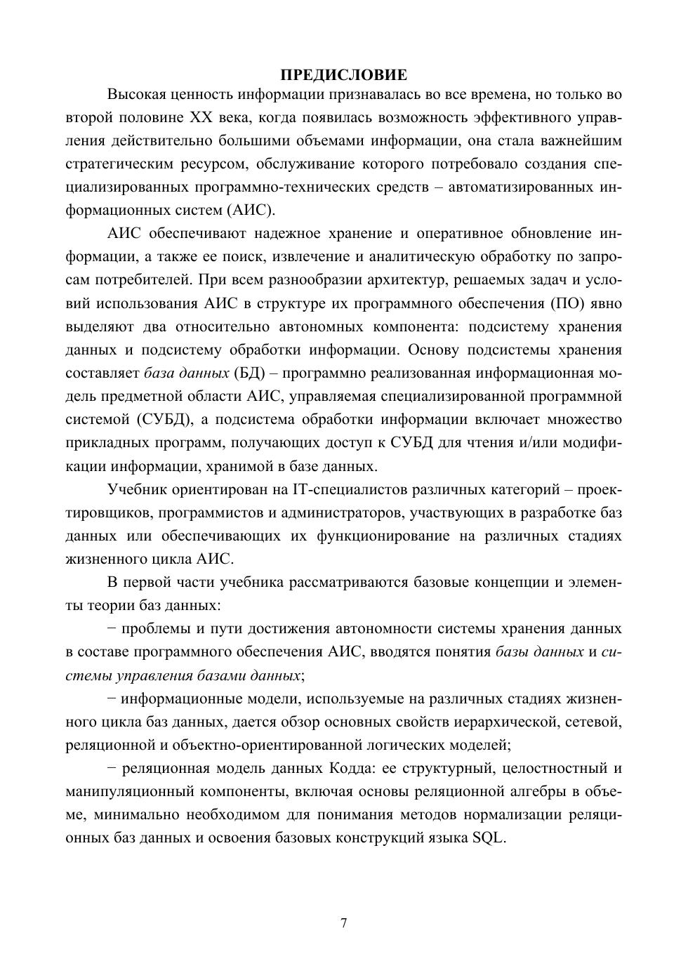 Базы данных — одно из направлений IT-индустрии, в рамках которого традиционно рассматриваются технологии надежного хранения больших объемов информации, ее эффективного поиска и извлечения по запросам потребителей. Материал, представленный в учебнике, охватывает основные фазы жизненного цикла базы данных: последовательно обсуждаются основные концепции, проблематика и элементы теории баз данных, рассматриваются процессы их проектирования, программирования и управления, а также технологии администрирования баз данных с целью достижения высокой производительности доступа к данным и обеспечения требуемого уровня информационной безопасности. База данных рассматривается как информационная модель предметной области, а ее разработка — как многоэтапный процесс последовательного преобразования концептуальной модели в логическую (реляционную) модель данных на стадии проектирования, последующей программной реализации логической модели средствами языка SQL и настройки параметров физической модели в процессе эксплуатации базы данных. Основное внимание уделено прикладным аспектам технологий баз данных, изложение материала сопровождается многочисленными примерами и листингами программного SQL-кода, а также практическими заданиями по проектированию, программированию и администрированию баз данных для самостоятельного выполнения. Соответствует современным требованиям Федерального государственного образовательного стандарта среднего профессионального образования и профессиональным квалификационным требованиям. Учебник предназначен для студентов IT-специальностей, обучающихся по программам среднего специального образования, и может быть использован преподавателями при подготовке лекционных курсов, проведении практических и лабораторных занятий, курсовом проектировании.