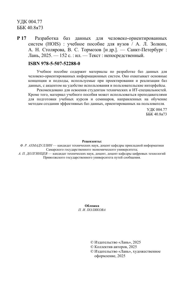 Учебное пособие содержит материалы по разработке баз данных для человеко-ориентированных информационных систем. Оно охватывает основные концепции и подходы, используемые при проектировании и реализации баз данных, с акцентом на удобство использования и пользовательские интерфейсы. Рекомендовано для освоения студентам технических и ИТ-специальностей. Кроме того, материал учебного пособия может использоваться преподавателями для подготовки учебных курсов и семинаров, направленных на обучение методам создания эффективных баз данных, ориентированных на пользователя.