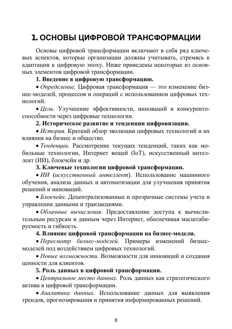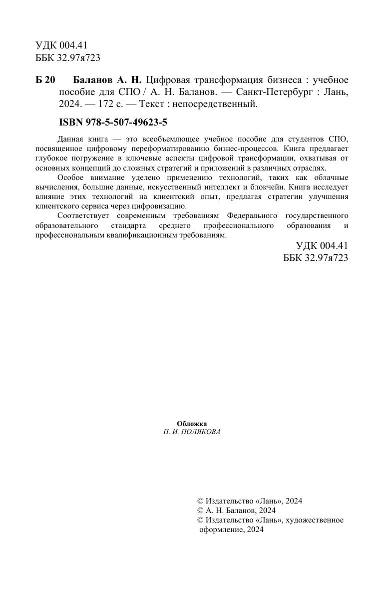 Данная книга — это всеобъемлющее учебное пособие для студентов СПО, посвященное цифровому переформатированию бизнес-процессов. Книга предлагает глубокое погружение в ключевые аспекты цифровой трансформации, охватывая от основных концепций до сложных стратегий и приложений в различных отраслях. Особое внимание уделено применению технологий, таких как облачные вычисления, большие данные, искусственный интеллект и блокчейн. Книга исследует влияние этих технологий на клиентский опыт, предлагая стратегии улучшения клиентского сервиса через цифровизацию. Соответствует современным требованиям Федерального государственного образовательного стандарта среднего профессионального образования и профессиональным квалификационным требованиям.