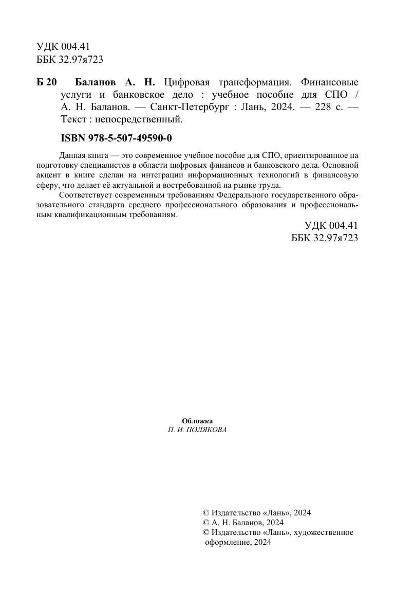 Данная книга — это современное учебное пособие для СПО, ориентированное на подготовку специалистов в области цифровых финансов и банковского дела. Основной акцент в книге сделан на интеграции информационных технологий в финансовую сферу, что делает её актуальной и востребованной на рынке труда. Соответствует современным требованиям Федерального государственного образовательного стандарта среднего профессионального образования и профессиональным квалификационным требованиям.