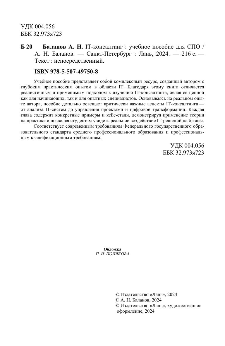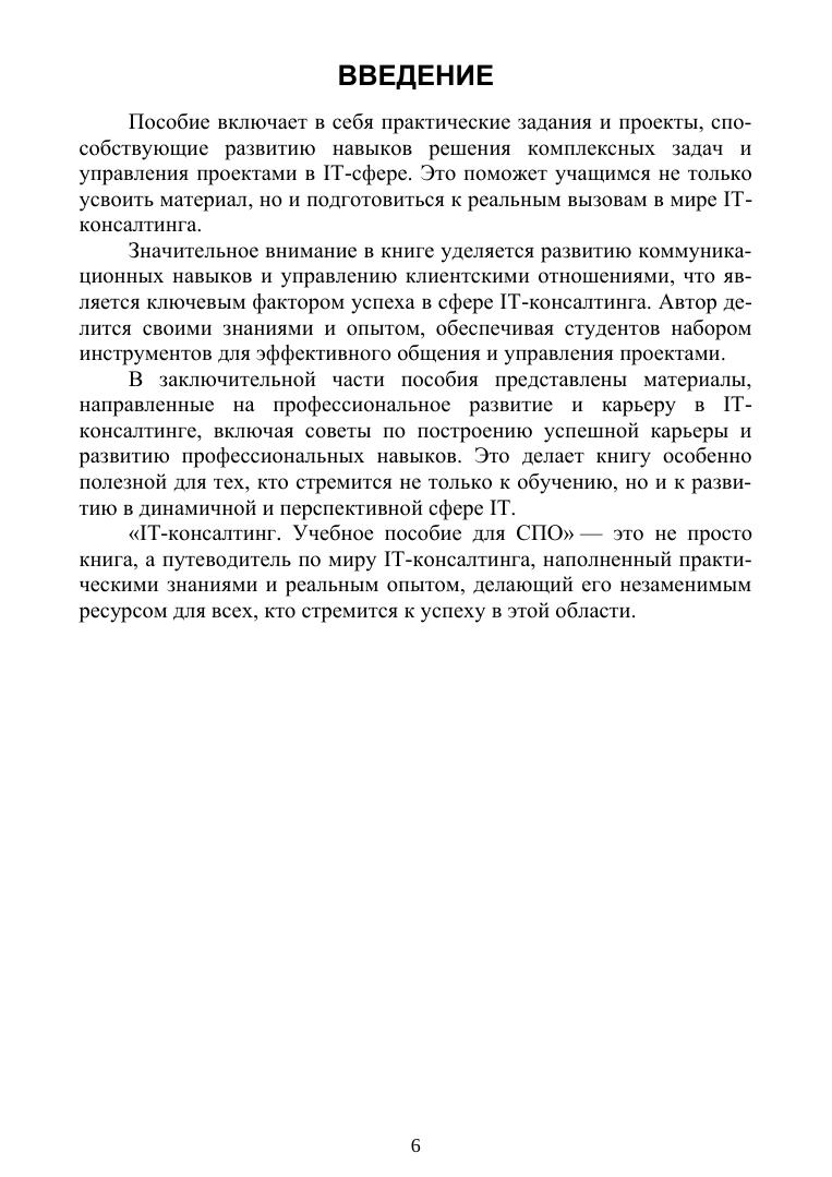 Учебное пособие представляет собой комплексный ресурс, созданный автором с глубоким практическим опытом в области IT. Благодаря этому книга отличается реалистичным и применимым подходом к изучению IT-консалтинга, делая её ценной как для начинающих, так и для опытных специалистов. Основываясь на реальном опыте автора, пособие детально освещает критически важные аспекты IT-консалтинга — от анализа IT-систем до управления проектами и цифровой трансформации. Каждая глава содержит конкретные примеры и кейс-стади, демонстрируя применение теории на практике и позволяя студентам увидеть реальное воздействие IT-решений на бизнес. Соответствует современным требованиям Федерального государственного образовательного стандарта среднего профессионального образования и профессиональным квалификационным требованиям.