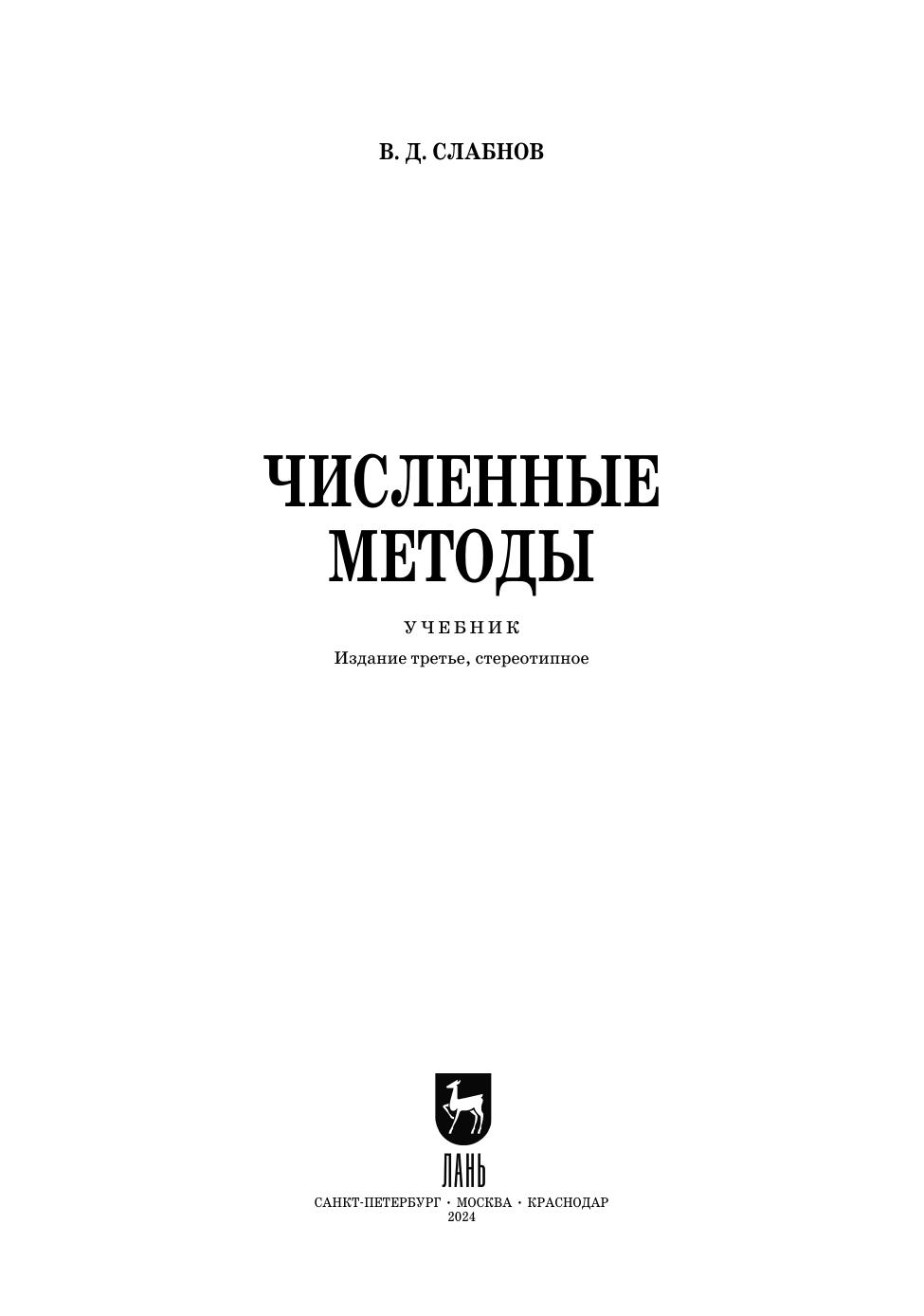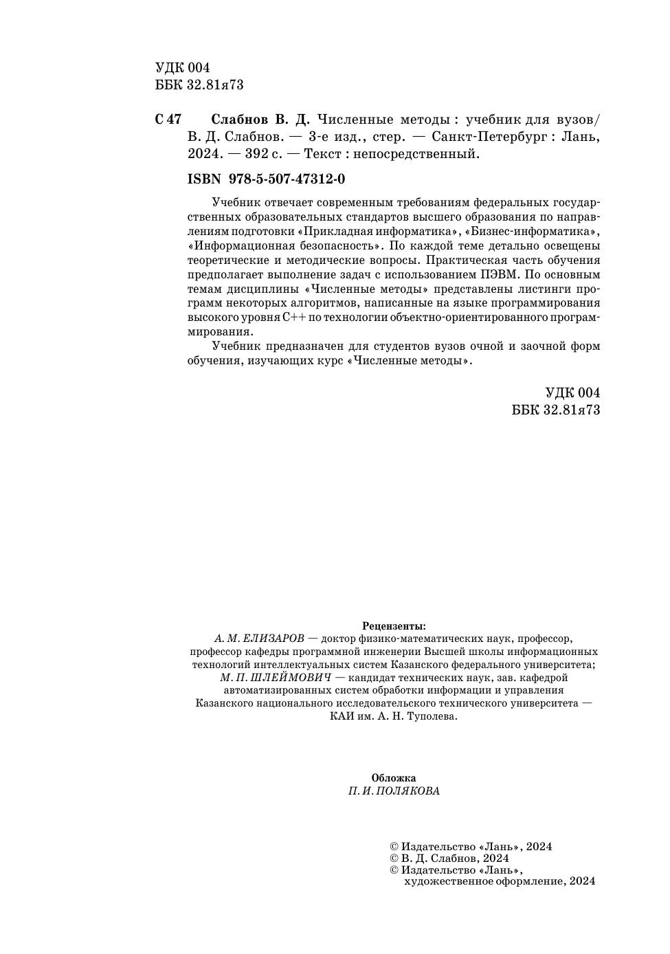 Учебник отвечает современным требованиям Федеральных государственных образовательных стандартов высшего образования по направлениям подготовки «Прикладная информатика», «Бизнес-информатика», «Информационная безопасность». По каждой теме детально освещены теоретические и методические вопросы. Практическая часть обучения предполагает выполнение задач с использованием ПЭВМ. По основным темам дисциплины «Численные методы» представлены листинги программ некоторых алгоритмов, написанные на языке программирования высокого уровня С++ по технологии объектно-ориентированного программирования. Учебник предназначен для студентов вузов очной и заочной форм обучения, изучающих курс «Численные методы».
