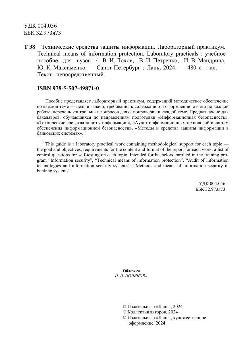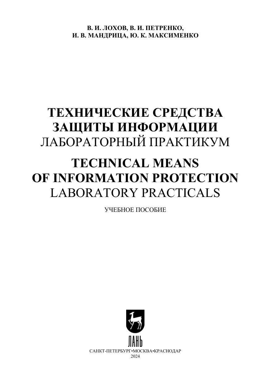 Пособие представляет лабораторный практикум, содержащий методическое обеспечение по каждой теме — цель и задачи, требования к содержанию и оформлению отчета по каждой работе, перечень контрольных вопросов для самопроверки к каждой теме. Предназначено для бакалавров, обучающихся по направлениям подготовки «Информационная безопасность», «Технические средства защиты информации», «Аудит информационных технологий и систем обеспечения информационной безопасности», «Методы и средства защиты информации в банковских системах». This guide is a laboratory practical work containing methodological support for each topic — the goal and objectives, requirements for the content and format of the report for each work, a list of control questions for self-testing on each topic. Intended for bachelors enrolled in the training program “Information security”, “Technical means of information protection”, “Audit of information technologies and information security systems”, “Methods and means of information security in banking systems”.
