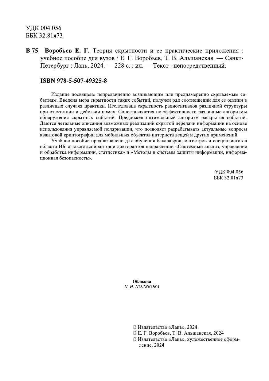 Издание посвящено непредвиденно возникающим или преднамеренно скрываемым событиям. Введена мера скрытности таких событий, получен ряд соотношений для ее оценки в различных случаях практики. Исследована скрытность радиосигналов различной структуры при отсутствии и действии помех. Сопоставляются по эффективности различные алгоритмы обнаружения скрытных событий. Предложен оптимальный алгоритм раскрытия событий. Даются детальные описания возможных реализаций скрытой передачи информации на основе использования управляемой поляризации, что позволяет разрабатывать актуальные вопросы квантовой криптографии для мобильных объектов интернета вещей и других применений. Учебное пособие предназначено для обучения бакалавров, магистров и специалистов в области ИБ, а также аспирантов и докторантов направлений «Системный анализ, управление и обработка информации, статистика» и «Методы и системы защиты информации, информационная безопасность».