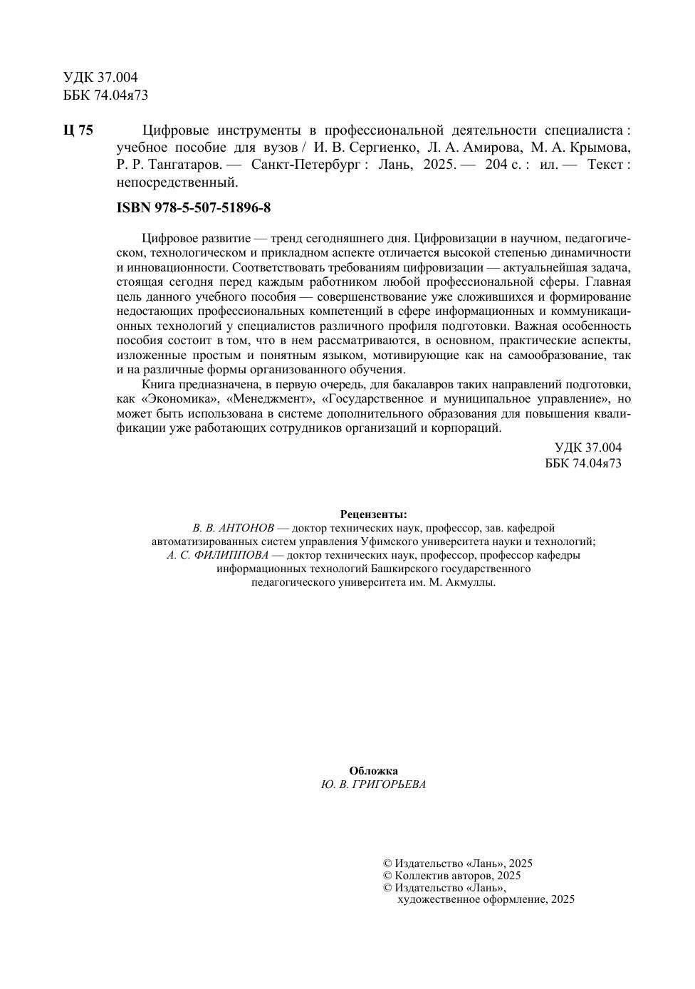 Цифровое развитие — тренд сегодняшнего дня. Цифровизации в научном, педагогическом, технологическом и прикладном аспекте отличается высокой степенью динамичности и инновационности. Соответствовать требованиям цифровизации — актуальнейшая задача, стоящая сегодня перед каждым работником любой профессиональной сферы. Главная цель данного учебного пособия — совершенствование уже сложившихся и формирование недостающих профессиональных компетенций в сфере информационных и коммуникационных технологий у специалистов различного профиля подготовки. Важная особенность пособия состоит в том, что в нем рассматриваются, в основном, практические аспекты, изложенные простым и понятным языком, мотивирующие как на самообразование, так и на различные формы организованного обучения. Книга предназначена, в первую очередь, для бакалавров таких направлений подготовки, как «Экономика», «Менеджмент», «Государственное и муниципальное управление», но может быть использована в системе дополнительного образования для повышения квалификации уже работающих сотрудников организаций и корпораций.