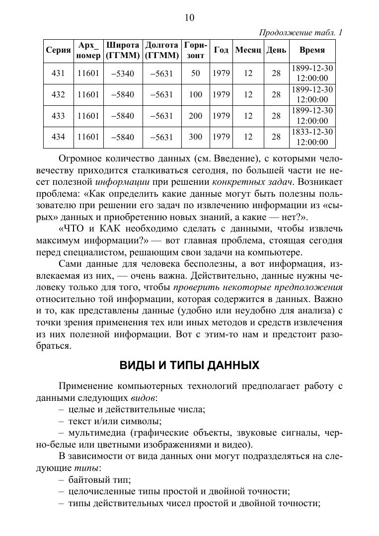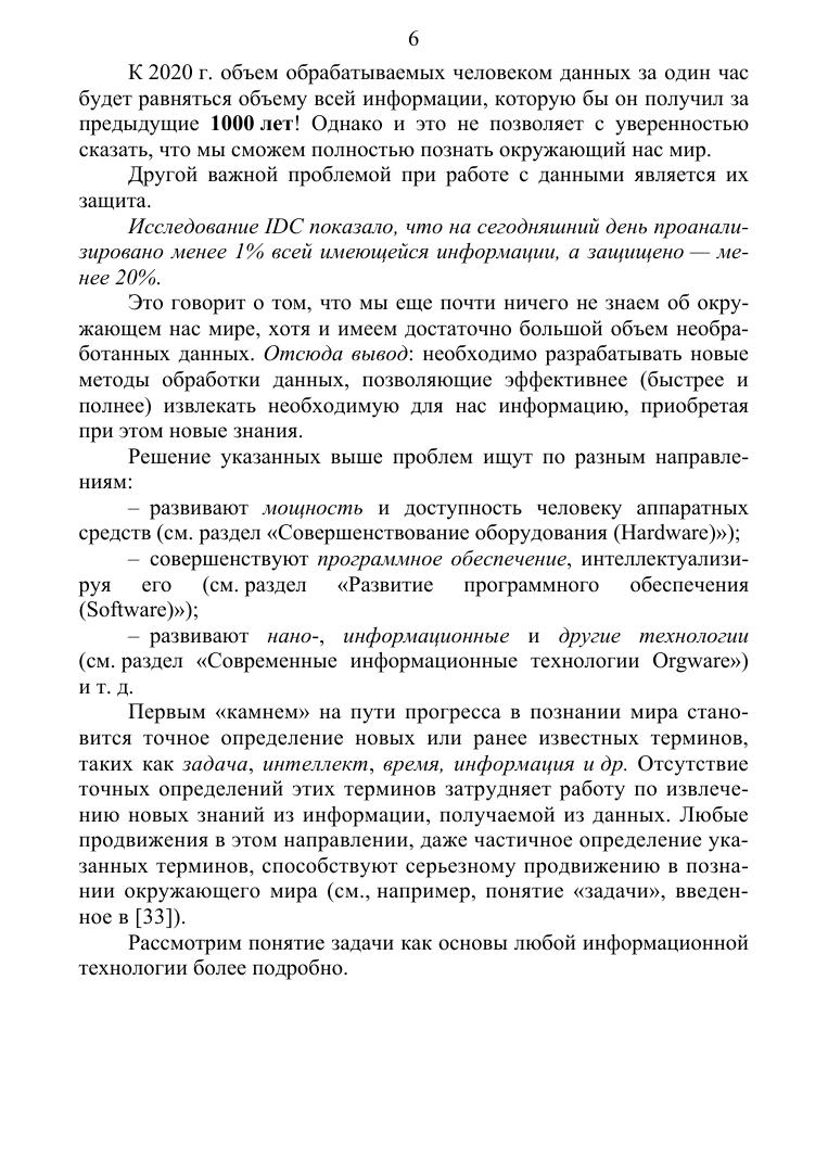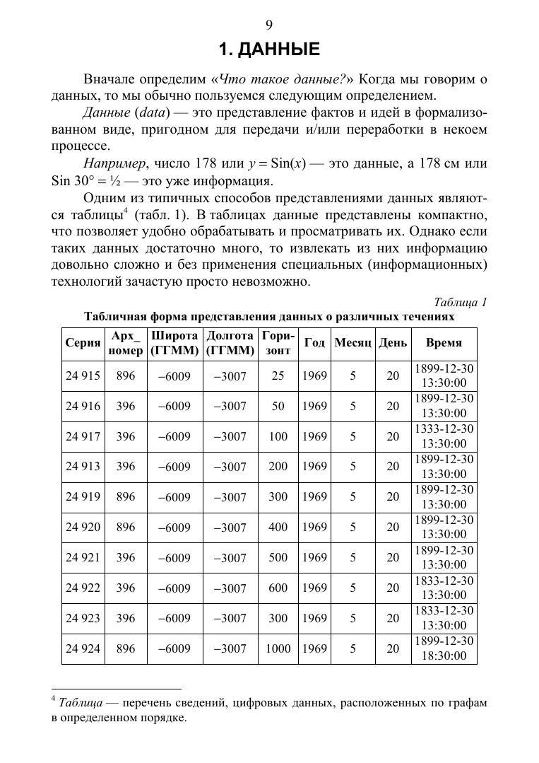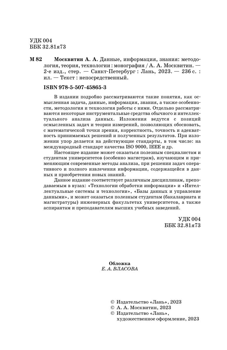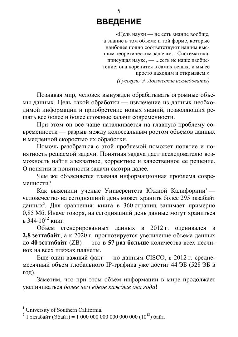 В издании подробно рассматриваются такие понятия, как осмысленная задача, данные, информация, знания, а также особенности, методология и технология работы с ними. Отдельно рассматриваются некоторые инструментальные средства обычного и интеллектуального анализа данных. Изложения ведется с позиций осмысленных задач и теории измерений, позволяющих обосновать, с математической точки зрения, корректность, точность и адекватность принимаемых решений и полученных результатов. При изложении упор делается на действующие стандарты, в том числе на международный стандарт качества ISO 9000, IEEE и др. Настоящее издание может оказаться полезным специалистам и студентам университетов (особенно магистрам), изучающим и применяющим современные методы анализа, при решении задач оперативного и полного извлечения информации, содержащейся в данных и приобретения новых знаний. Данное издание соответствует различным дисциплинам, преподаваемым в вузах: «Технологии обработки информации» и «Интеллектуальные системы и технологии», «Базы данных и управление данными», и может оказаться полезным студентам (бакалавриата и магистратуры) инженерных факультетов университетов, а также аспирантам и преподавателям средних и высших учебных заведений.