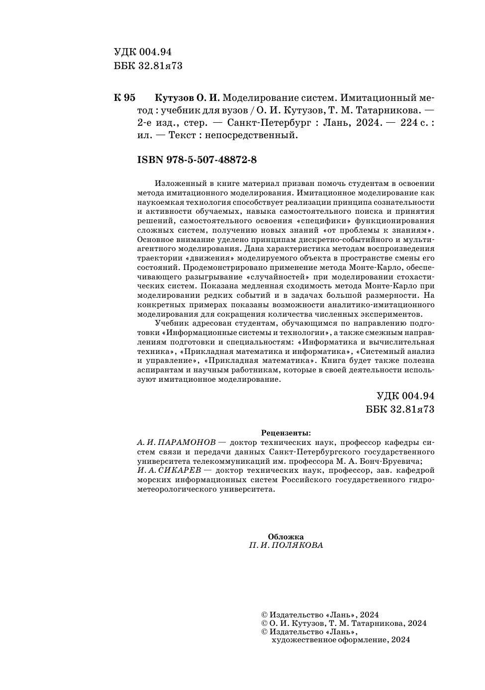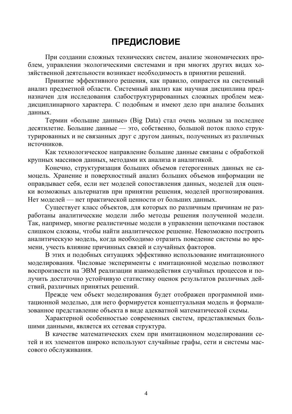 Изложенный в книге материал призван помочь студентам в освоении метода имитационного моделирования. Имитационное моделирование как наукоемкая технология способствует реализации принципа сознательности и активности обучаемых, навыка самостоятельного поиска и принятия решений, самостоятельного освоения «специфики» функционирования сложных систем, получению новых знаний «от проблемы к знаниям». Основное внимание уделено принципам дискретно-событийного и мультиагентного моделирования. Дана характеристика методам воспроизведения траектории «движения» моделируемого объекта в пространстве смены его состояний. Продемонстрировано применение метода Монте-Карло, обеспечивающего разыгрывание «случайностей» при моделировании стохастических систем. Показана медленная сходимость метода Монте-Карло при моделировании редких событий и в задачах большой размерности. На конкретных примерах показаны возможности аналитико-имитационного моделирования для сокращения количества численных экспериментов. Учебник адресован студентам, обучающимся по направлению подготовки «Информационные системы и технологии», а также смежным направлениям подготовки и специальностям: «Информатика и вычислительная техника», «Прикладная математика и информатика», «Системный анализ и управление», «Прикладная математика». Книга будет также полезна аспирантам и научным работникам, которые в своей деятельности используют имитационное моделирование.