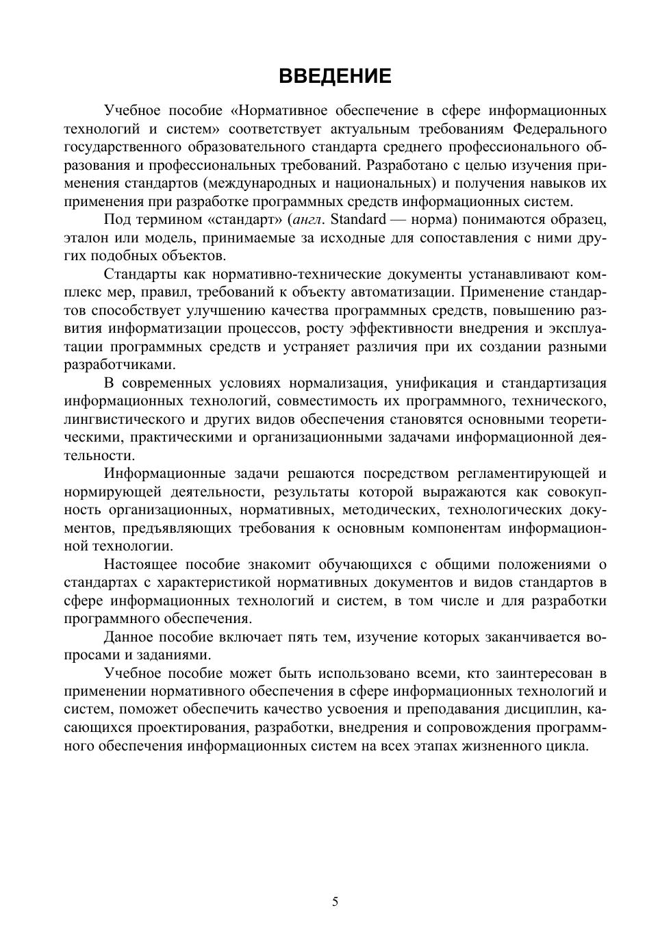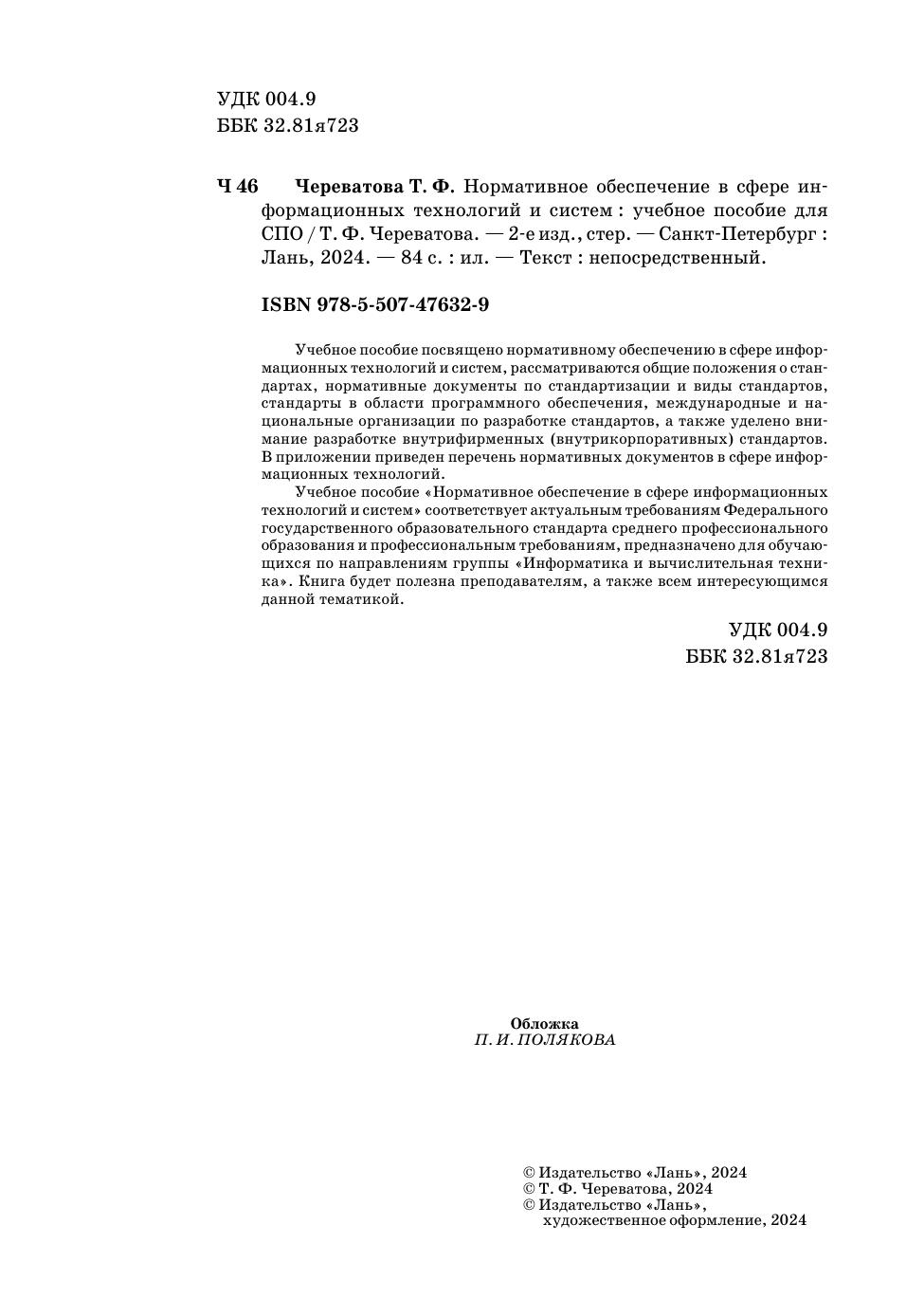 Учебное пособие посвящено нормативному обеспечению в сфере информационных технологий и систем, рассматриваются общие положения о стандартах, нормативные документы по стандартизации и виды стандартов, стандарты в области программного обеспечения, международные и национальные организации по разработке стандартов, а также уделено внимание разработке внутрифирменных (внутрикорпоративных) стандартов. В приложении приведен перечень нормативных документов в сфере информационных технологий. Учебное пособие «Нормативное обеспечение в сфере информационных технологий и систем» соответствует актуальным требованиям Федерального государственного образовательного стандарта среднего профессионального образования и профессиональным требованиям, предназначено для обучающихся по направлениям группы «Информатика и вычислительная техника». Книга будет полезна преподавателям, а также всем интересующимся данной тематикой.