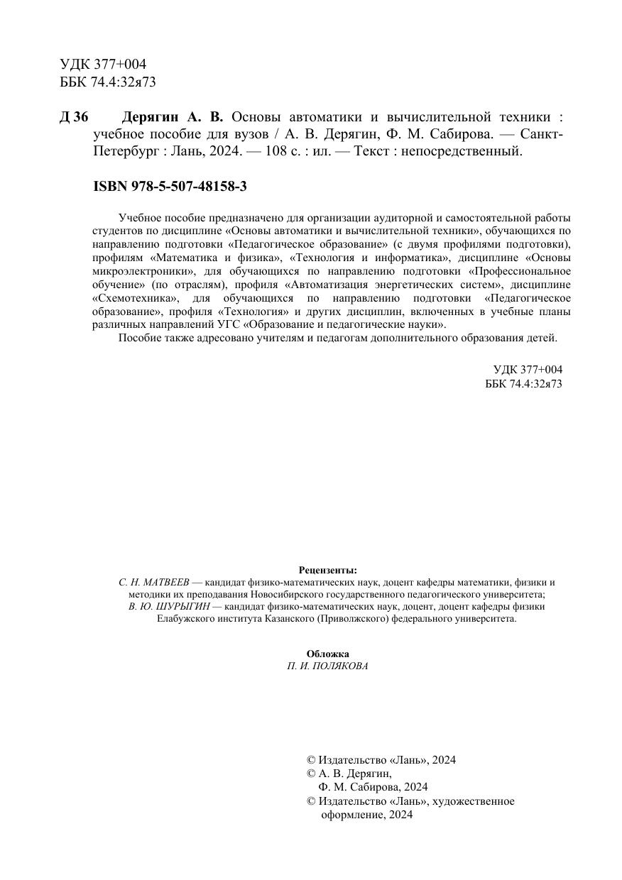 Учебное пособие предназначено для организации аудиторной и самостоятельной работы студентов по дисциплине «Основы автоматики и вычислительной техники», обучающихся по направлению подготовки «Педагогическое образование» (с двумя профилями подготовки), профилям «Математика и физика», «Технология и информатика», дисциплине «Основы микроэлектроники», для обучающихся по направлению подготовки «Профессиональное обучение» (по отраслям), профиля «Автоматизация энергетических систем», дисциплине «Схемотехника», для обучающихся по направлению подготовки «Педагогическое образование», профиля «Технология» и других дисциплин, включенных в учебные планы различных направлений УГС «Образование и педагогические науки». Пособие также адресовано учителям и педагогам дополнительного образования детей.