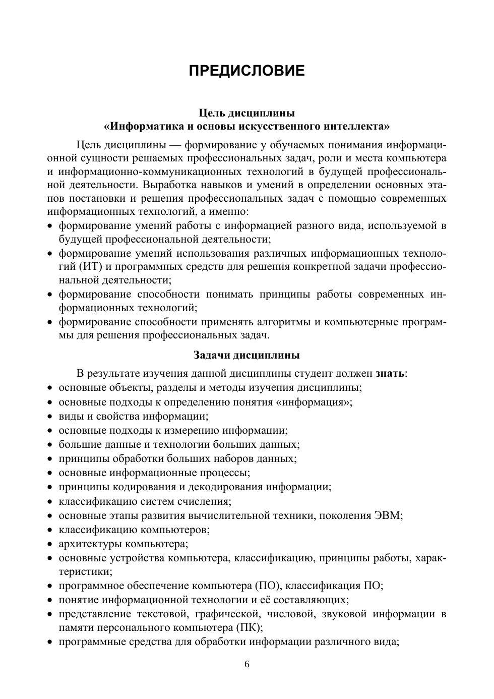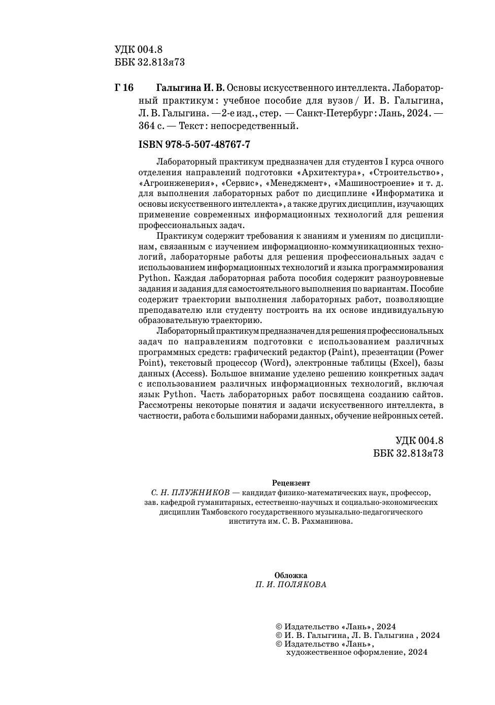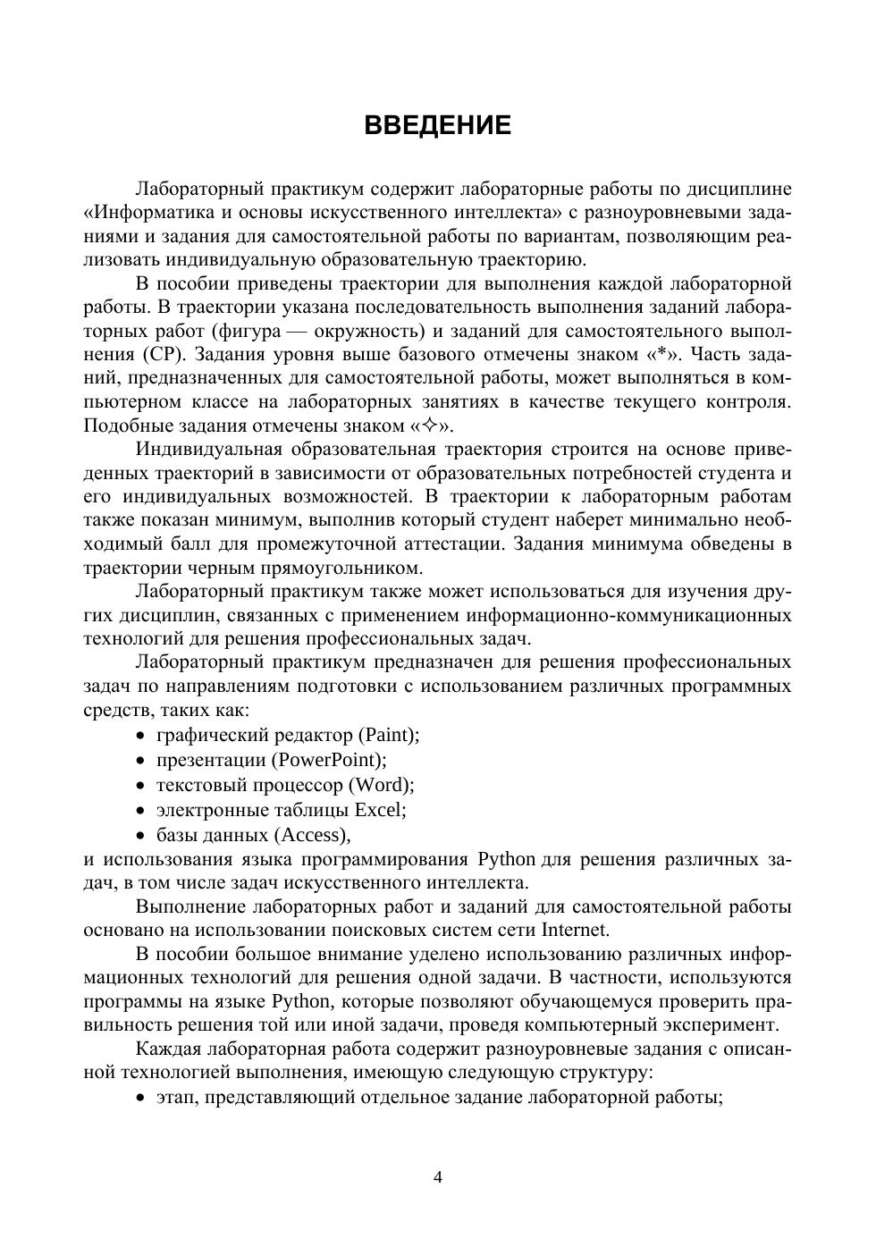 Лабораторный практикум предназначен для студентов I курса очного отделения направлений подготовки «Архитектура», «Строительство», «Агроинженерия», «Сервис», «Менеджмент», «Машиностроение» и т. д. для выполнения лабораторных работ по дисциплине «Информатика и основы искусственного интеллекта», а также других дисциплин, изучающих применение современных информационных технологий для решения профессиональных задач. Практикум содержит требования к знаниям и умениям по дисциплинам, связанным с изучением информационно-коммуникационных технологий, лабораторные работы для решения профессиональных задач с использованием информационных технологий и языка программирования Python. Каждая лабораторная работа пособия содержит разноуровневые задания и задания для самостоятельного выполнения по вариантам. Пособие содержит траектории выполнения лабораторных работ, позволяющие преподавателю или студенту построить на их основе индивидуальную образовательную траекторию. Лабораторный практикум предназначен для решения профессиональных задач по направлениям подготовки с использованием различных программных средств: графический редактор (Paint), презентации (Power Point), текстовый процессор (Word), электронные таблицы (Excel), базы данных (Access). Большое внимание уделено решению конкретных задач с использованием различных информационных технологий, включая язык Python. Часть лабораторных работ посвящена созданию сайтов. Рассмотрены некоторые понятия и задачи искусственного интеллекта, в частности, работа с большими наборами данных, обучение нейронных сетей.