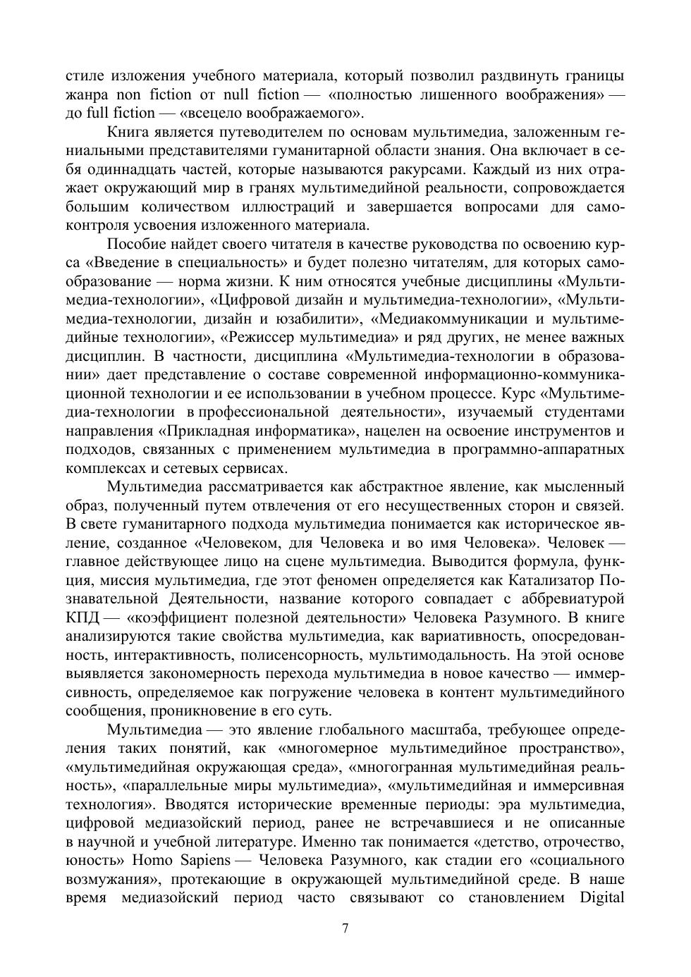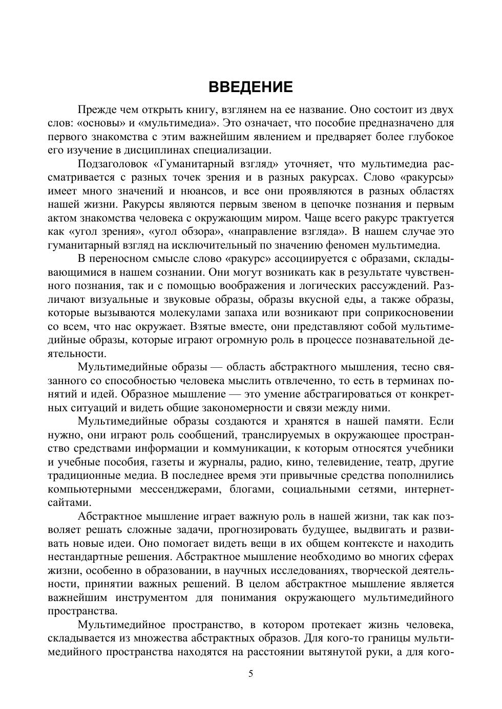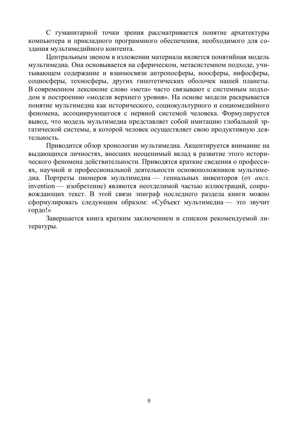 Мультимедиа сегодня — важнейшее информационно-коммуникационное окружение человека. Данное пособие разрабатывает представление об этом уникальном историческом феномене и является развитием гипотезы академика В. И. Вернадского о ноосфере и идей классика медиафилософии Герберта Маршалла Маклюэна о мультимедиа. Здесь впервые введено и подробно рассмотрено понятие «сфера мультимедиа», вставшее в один ряд с «биосферой», «социосферой», «техносферой», «антропосферой», «ноосферой» и «инфосферой». Концептуально выстроена и подробно описана сферическая модель мультимедиа, раскрывающая содержание и внутренние взаимосвязи этого важнейшего социального феномена. В текст книги органично включено большое количество авторских иллюстраций, каждая из которых является своеобразным мотиватором, способствующим более глубокому погружению читателей в излагаемый материал. Книга предлагается в качестве учебного пособия по дисциплине «Введение в мультимедиа», широко преподаваемой в вузах гуманитарного профиля, а также будет полезна в области самообразования и непрерывного обучения.