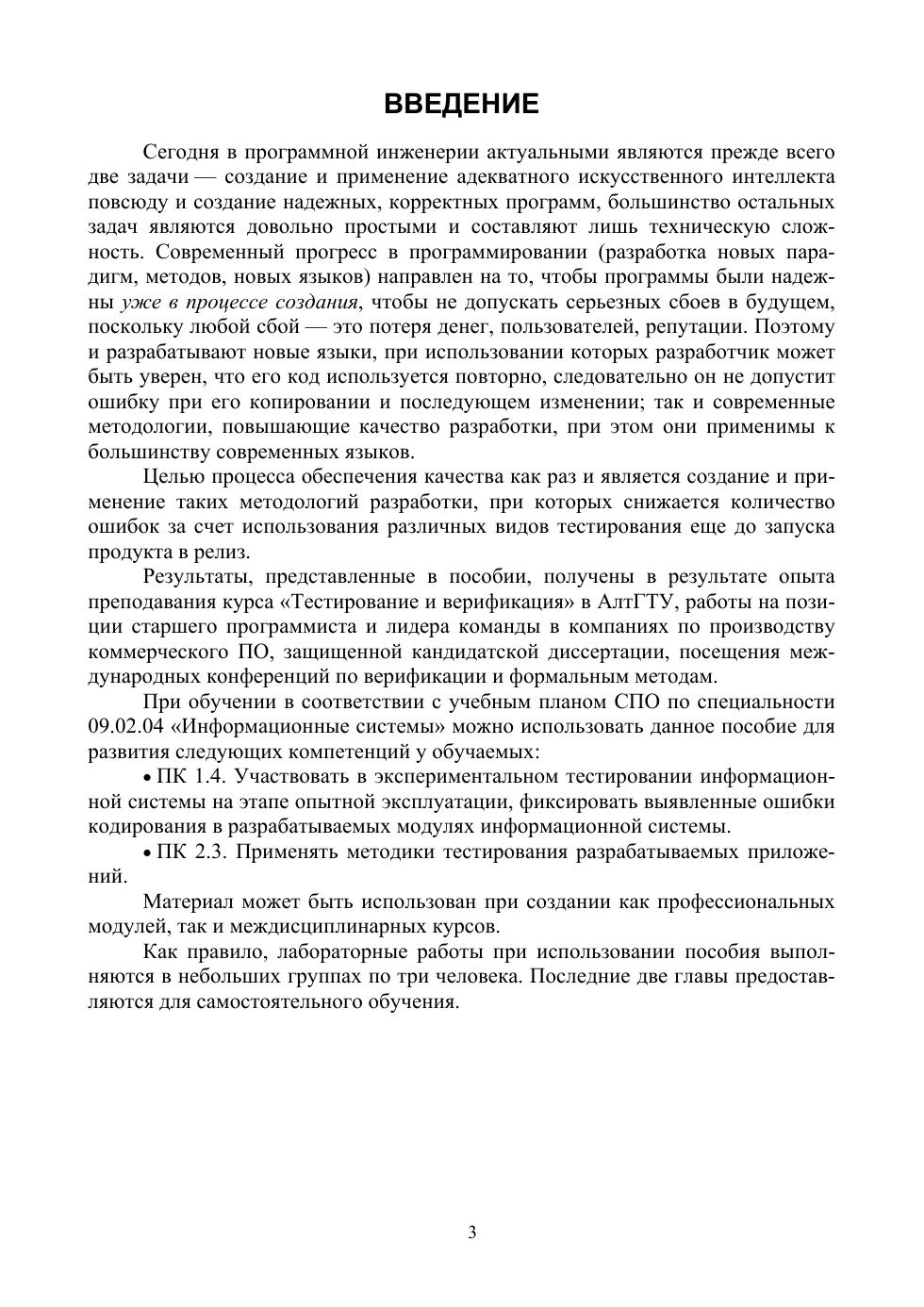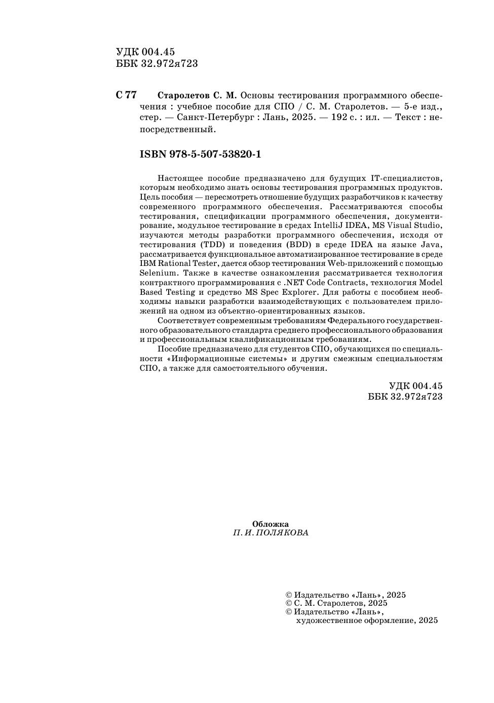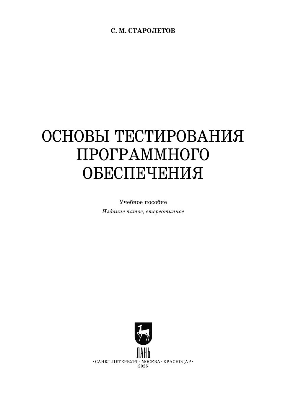 Настоящее пособие предназначено для будущих IT-специалистов, которым необходимо знать основы тестирования программных продуктов. Цель пособия – пересмотреть отношение будущих разработчиков к качеству современного программного обеспечения. Рассматриваются способы тестирования, спецификации программного обеспечения, документирование, модульное тестирование в средах IntelliJ IDEA, MS Visual Studio, изучаются методы разработки программного обеспечения, исходя от тестирования (TDD) и поведения (BDD) в среде IDEA на языке Java, рассматривается функциональное автоматизированное тестирование в среде IBM Rational Tester, дается обзор тестирования Web-приложений с помощью Selenium. Также в качестве ознакомления рассматривается технология контрактного программирования с .NET Code Contracts, технология Model Based Testing и средство MS Spec Explorer. Для работы с пособием необходимы навыки разработки взаимодействующих с пользователем приложений на одном из объектно-ориентированных языков. Соответствует современным требованиям Федерального государственного образовательного стандарта среднего профессионального образования и профессиональным квалификационным требованиям. Пособие предназначено для студентов СПО, обучающихся по специальности «Информационные системы» и другим смежным специальностям СПО, а также для самостоятельного обучения