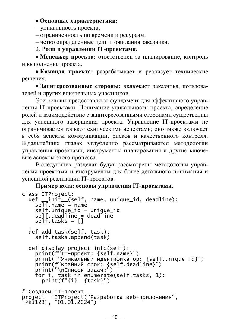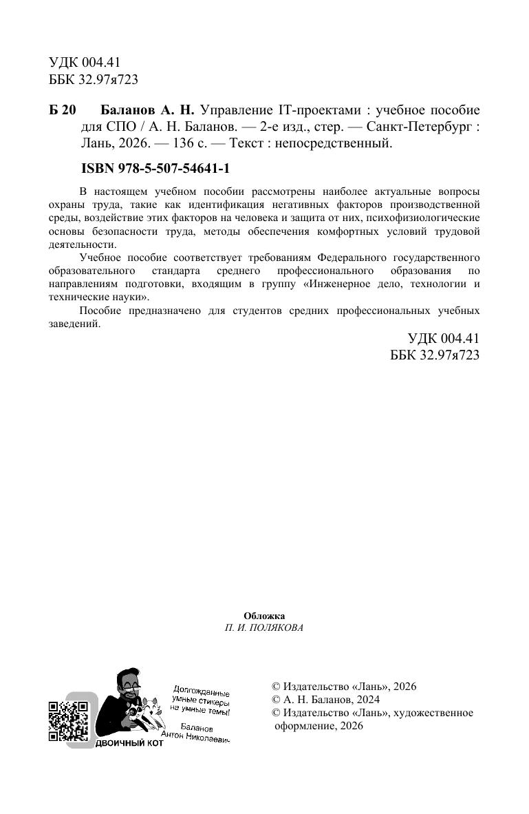 Данное учебное пособие охватывает все ключевые аспекты и лучшие практики в области IT-проектного управления. Особое внимание уделяется планированию IT-проектов, управлению командами, риск-менеджменту, а также контролю качества и стандартам. В пособии также рассмотрены аспекты управления клиентами и стейкхолдерами, финансового управления в IT-проектах, а также использование инструментов и технологий для эффективного управления проектами. Соответствует современным требованиям Федерального государственного образовательного стандарта среднего профессионального образования и профессиональным квалификационным требованиям.